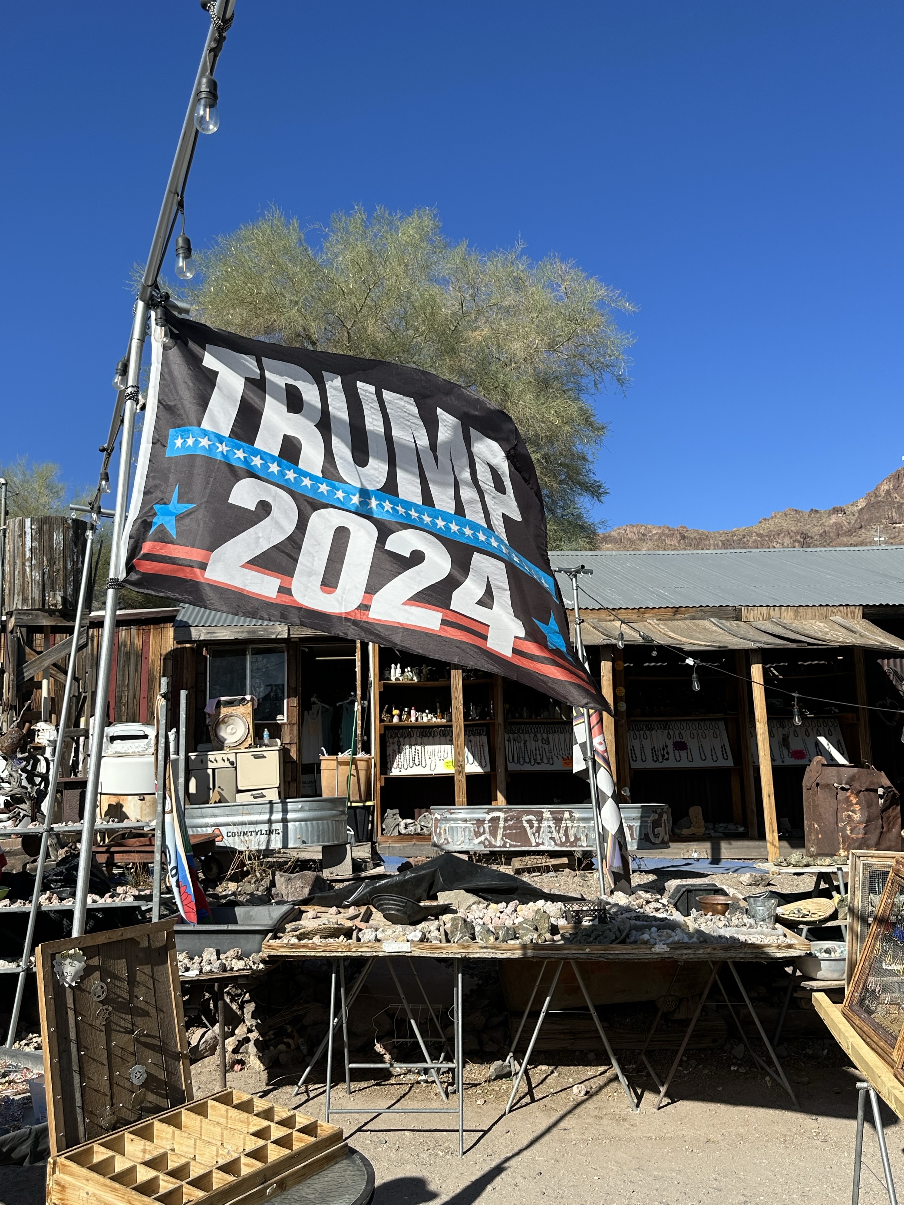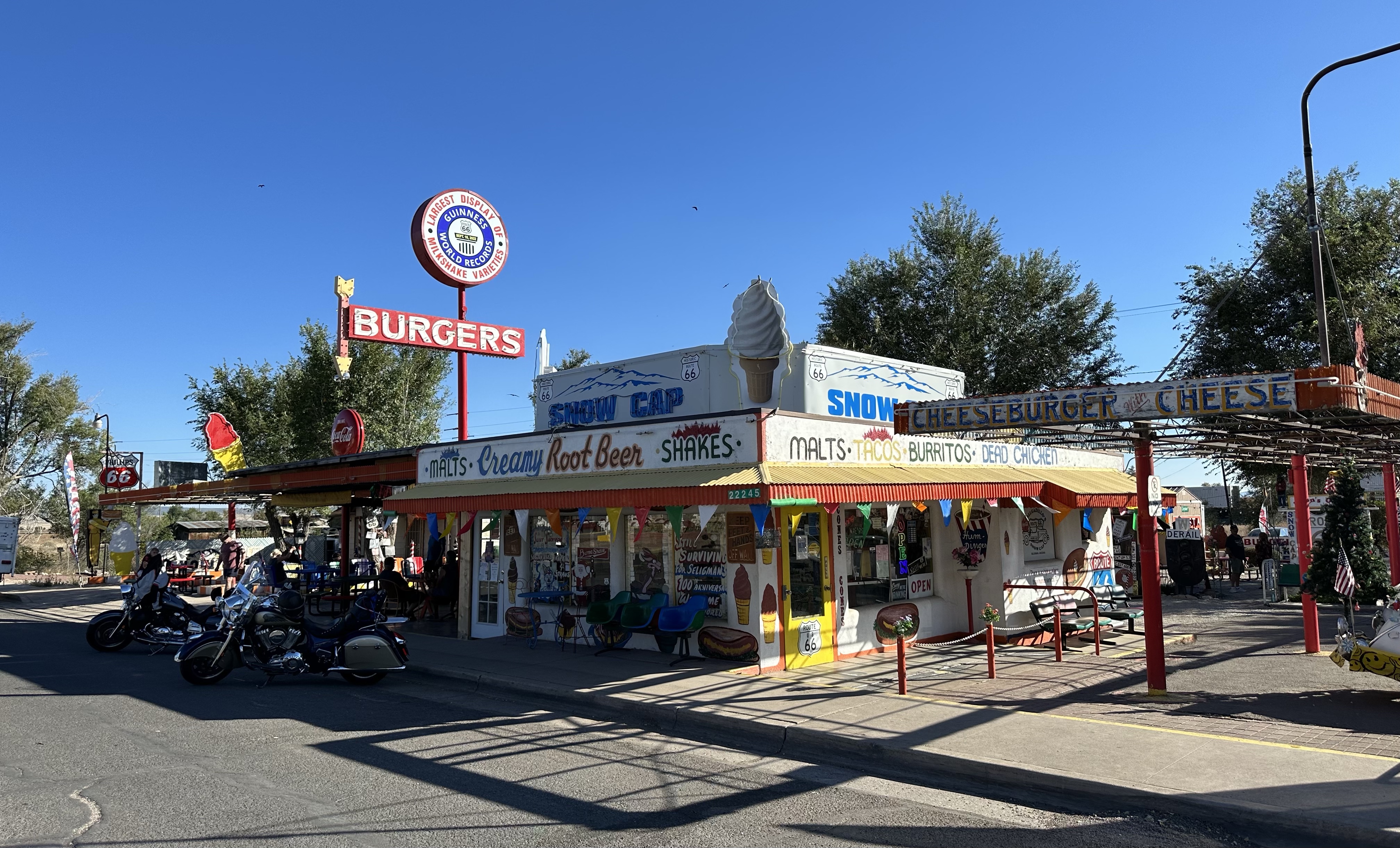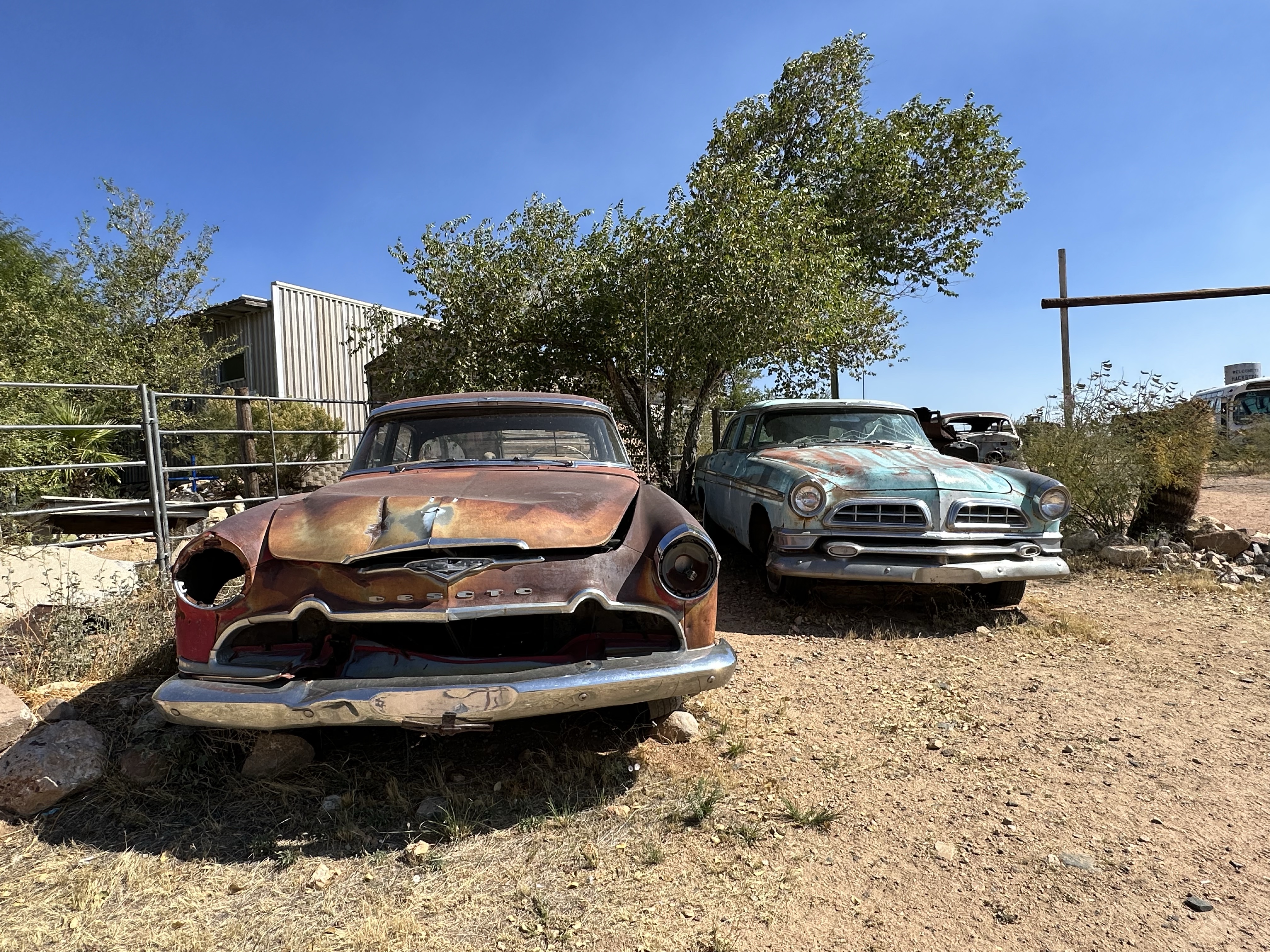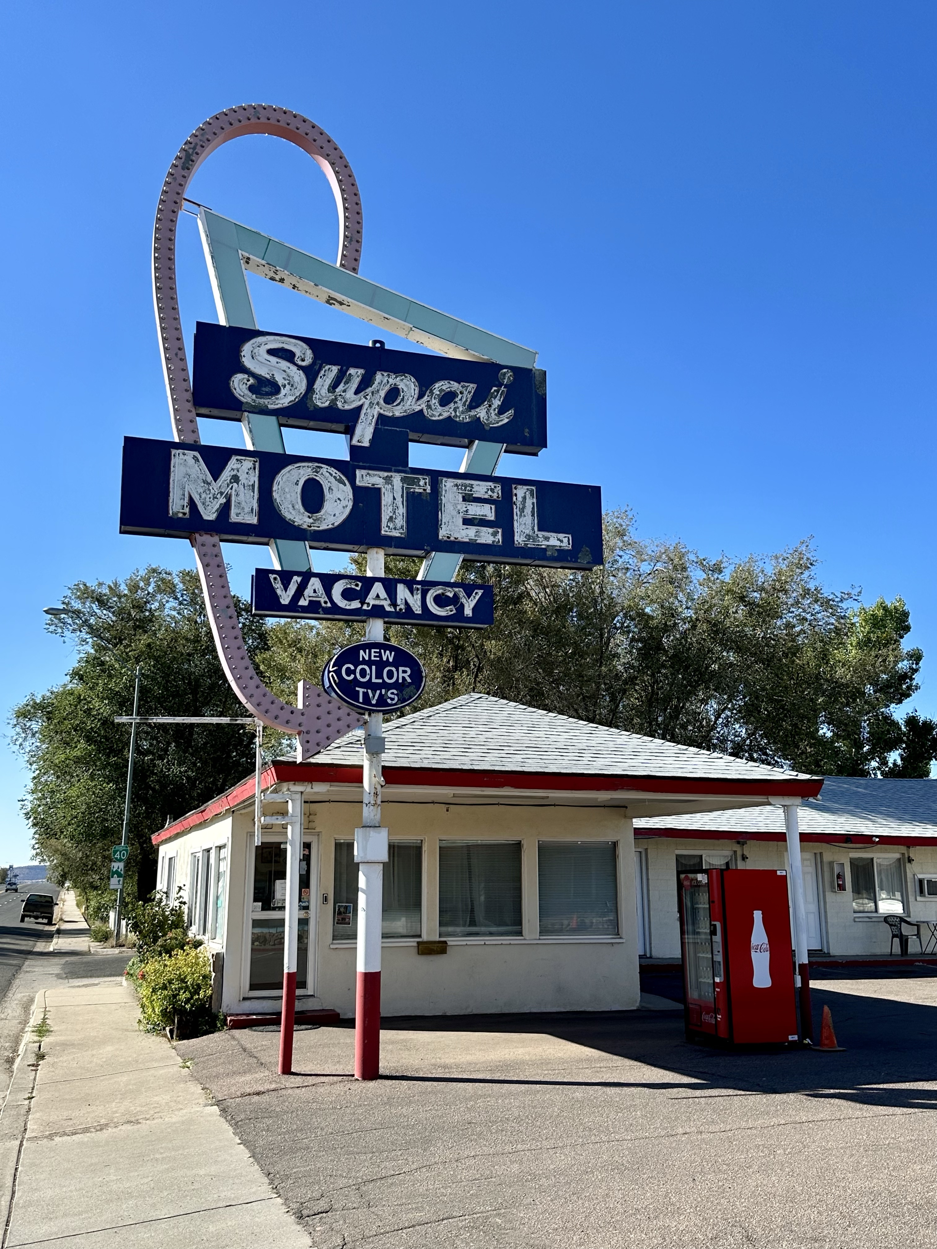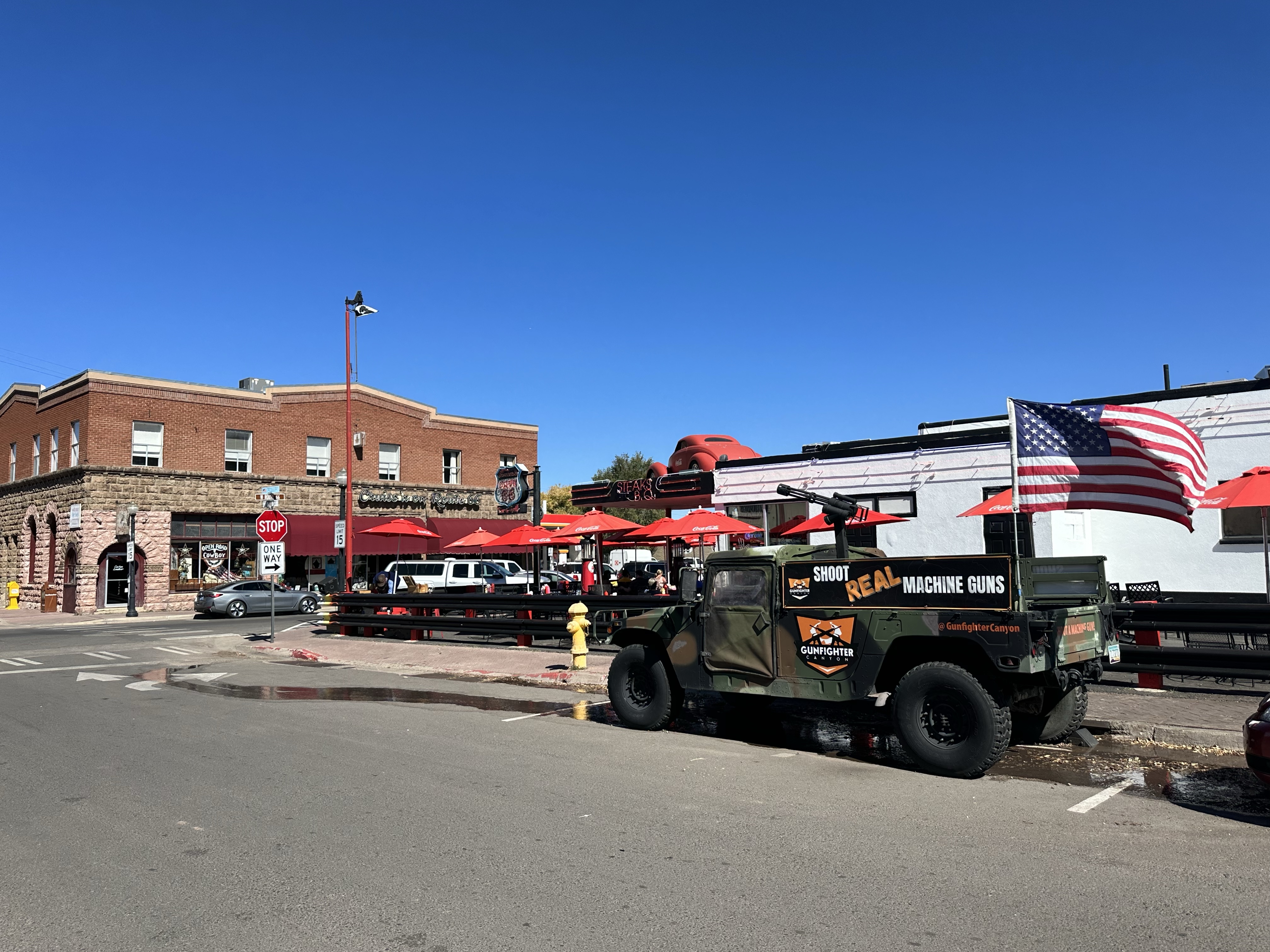 Continuing east on route 66 the drive there was much the same however there are a few iconic features on the way. Hackberry General Store was thriving on tourists passing by. A front yard full of ‘memorabilia’ be it abandoned cars, gas pumps, signs etc, it has that kind of ‘pull off the highway’ draw that is as successful now as it would have been in the 66 heyday. Of course, the store has lots of Route 66 merchandise, as does every place we stop! Further along is Seligman, hanging on by a thread, thankfully for the town, just off an I40 junction. Very different vibe to previous stops, possibly due to the local militia hanging out at their local (with ‘statement’ sign) who keep the Walmart gun sales going, no doubt. There were lots of great old signs and buildings in Seligman but we do wonder what’d happen if the tour busses stop dropping by the few tat shops that are there.