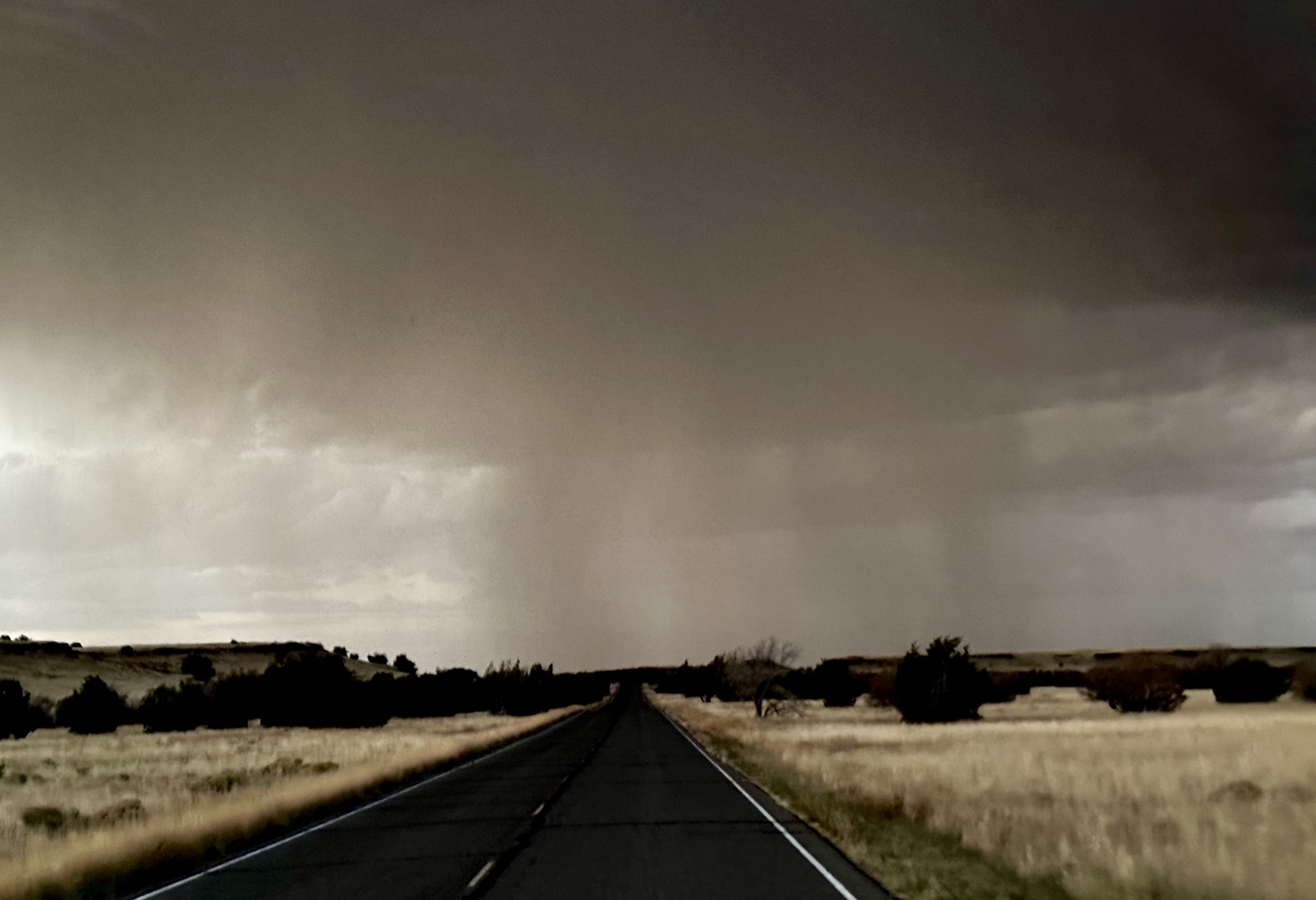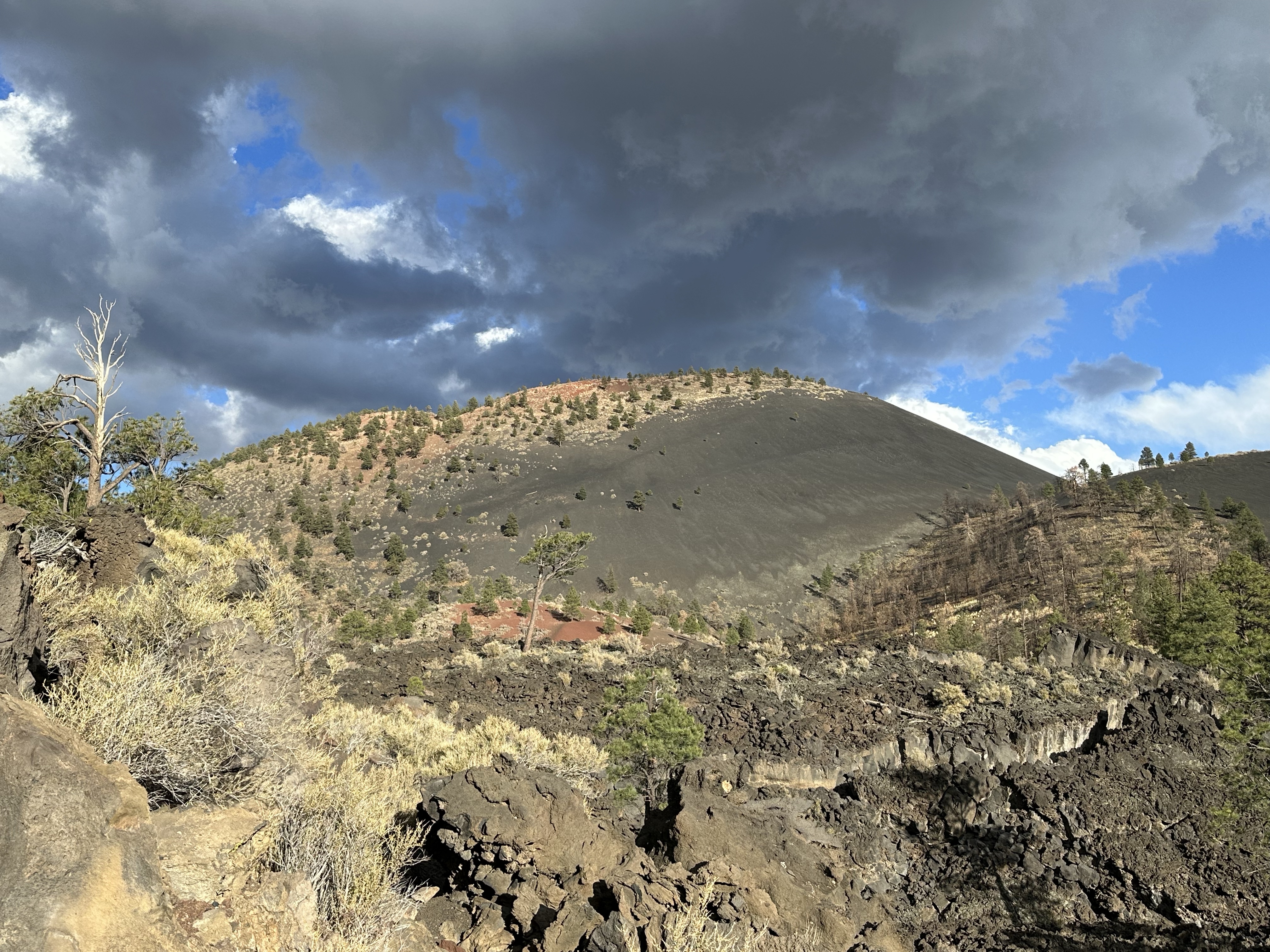 North of Flagstaff is a fascinating area called Wupatki where there remains ‘Pueblos’ and also Sunset Crater, both National Monuments. Sunset Crater is where the most recent volcanic activity has taken place in the area, erupting c. 1000 years ago. Walking around the area, we could see the Bonito Lava Flow and the yellow flowers contrasting the darkness. Great landscape, made more atmospheric by the skies. We realised a bit too late that we needed to head back to the van. Driving through the area in the dark with dramatic, thunder lighting and heavy rains was heart stopping but memorable! Probably one of the most spectacular skies either of us has ever seen.