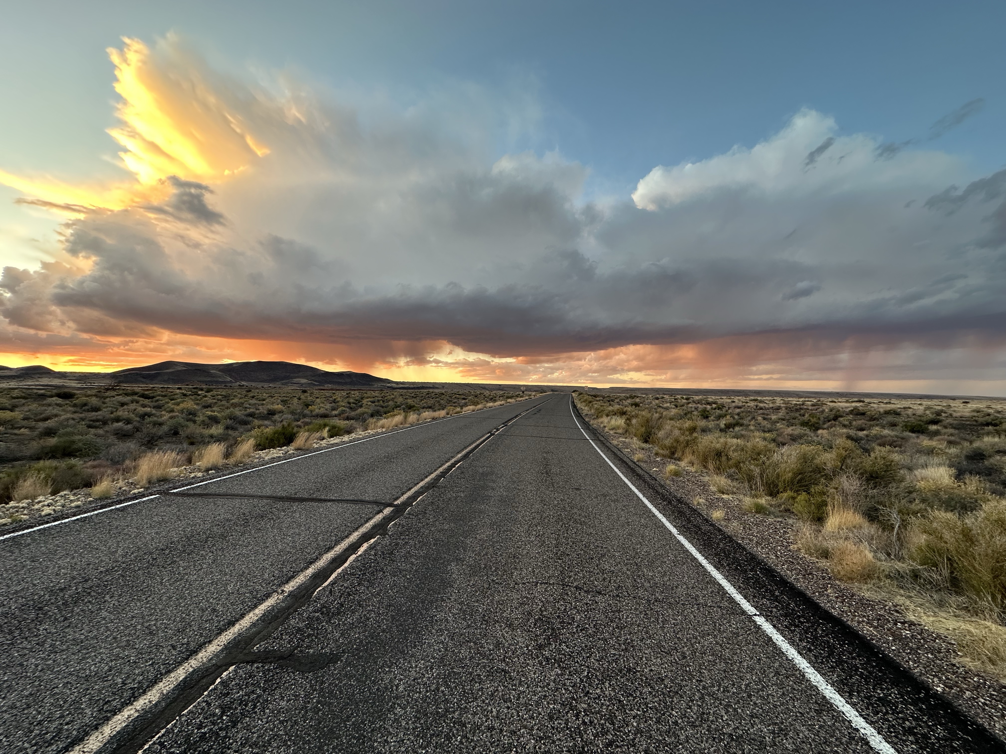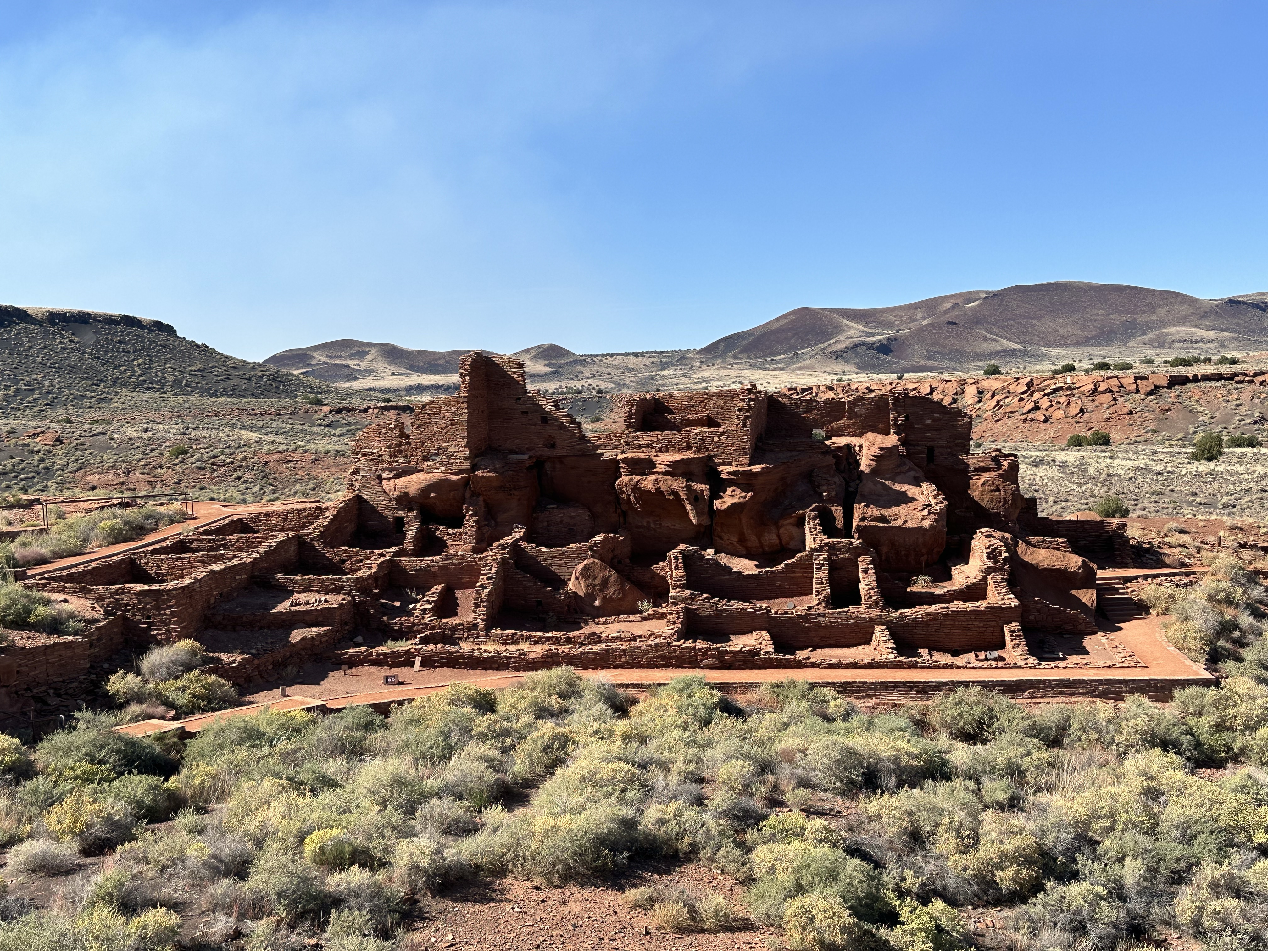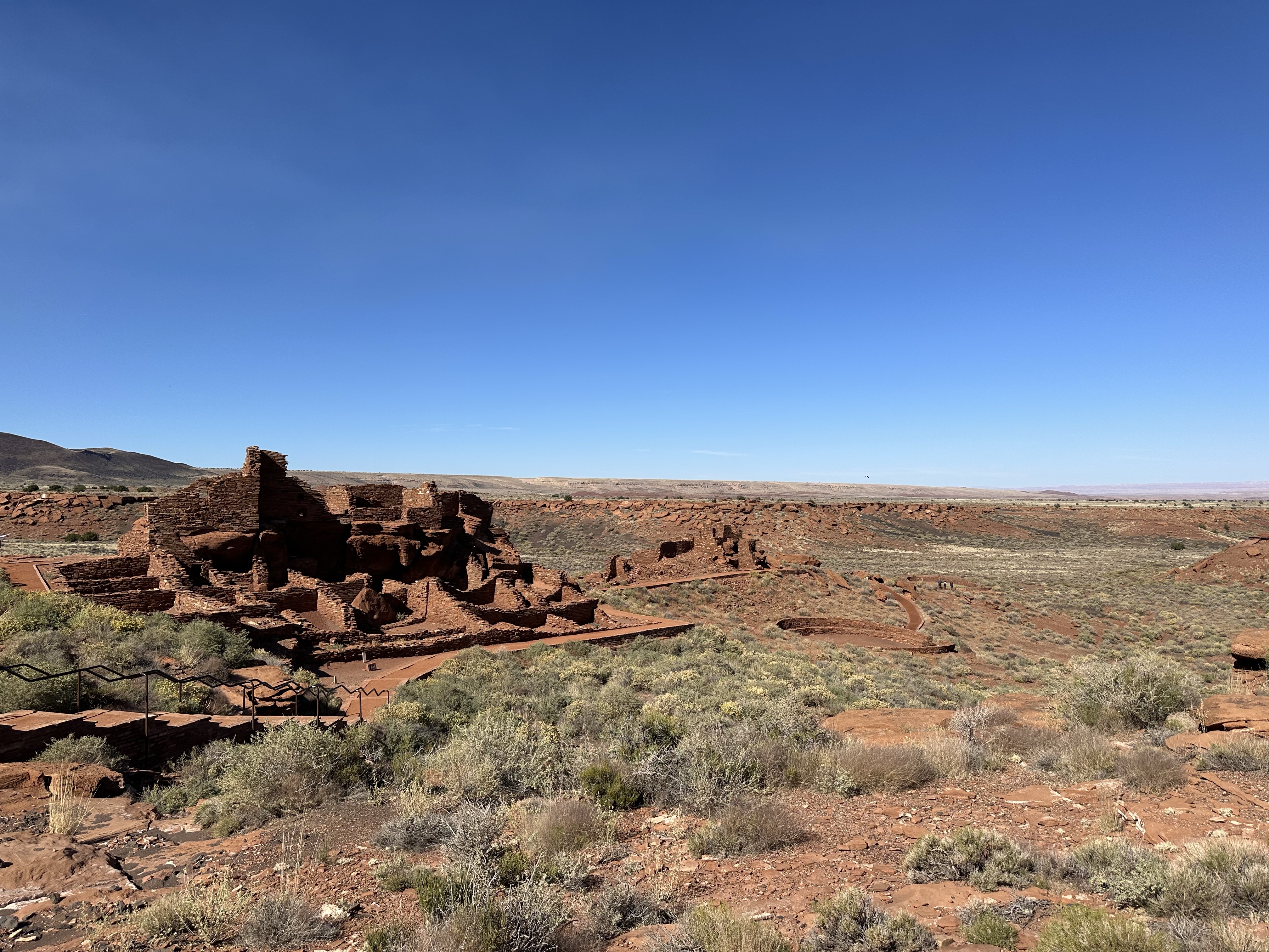 The following day it was like nothing had happened. We had arrived to camp in the dark and woke to rolling yellow fields and blue skies. We headed to the Pueblos where the Wupatki peoples had lived and we read about their shocking story at the visitor centre, like so many indigenous people, they’d been forced off their land, whole communities displaced and dismantled by greedy ranchers. The Pueblos, such as Citadel and Wupatki (main complex) date back over 900 years and show a vibrant society lived there. They were renamed Pueblos by the Spanish invaders in the 18th Century. The views from the high grounds were lovely, across the prairie landscape dotted with Juniper trees.