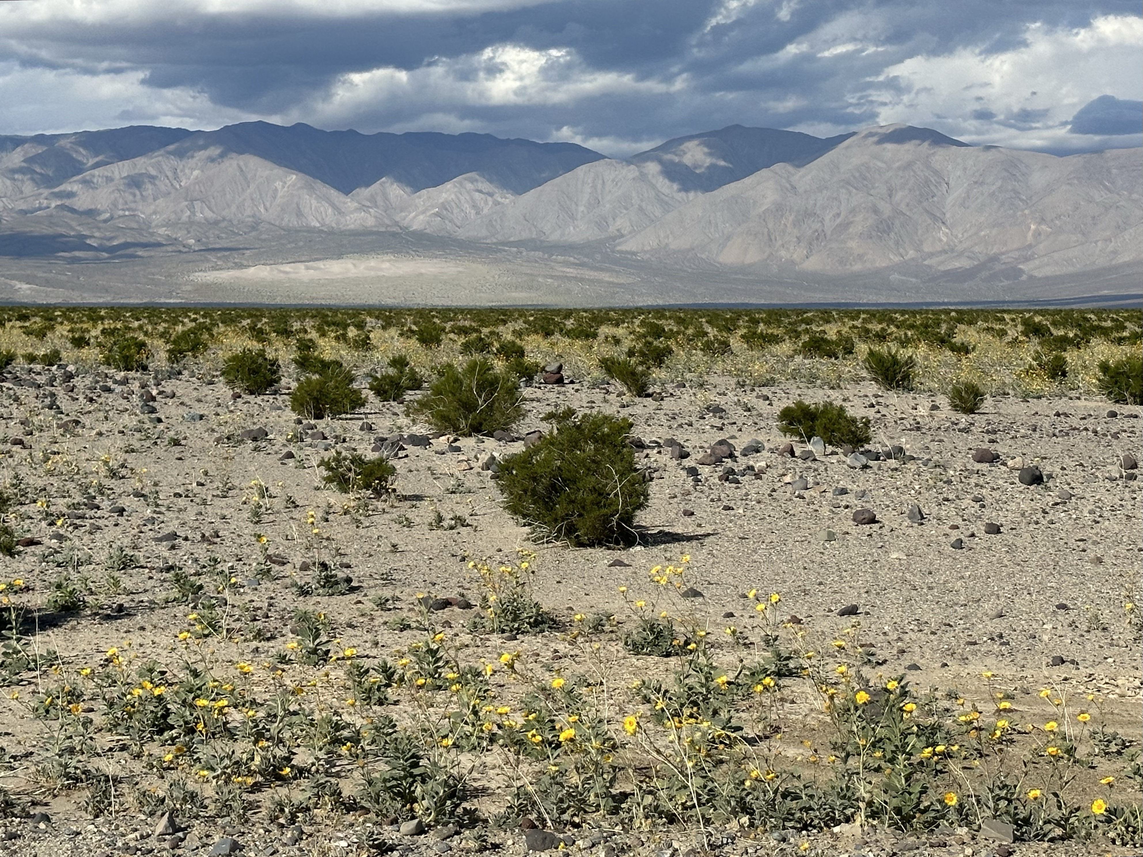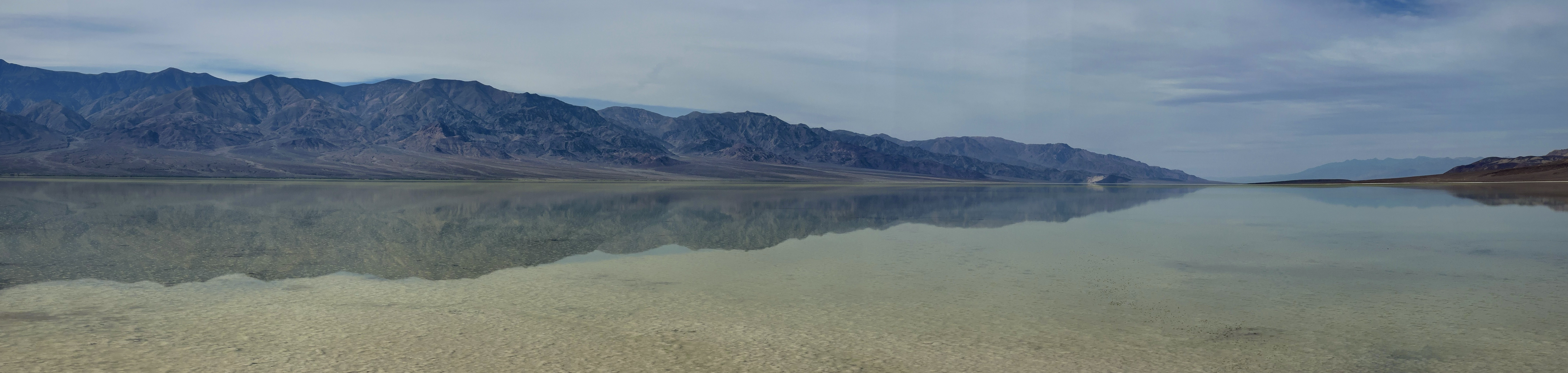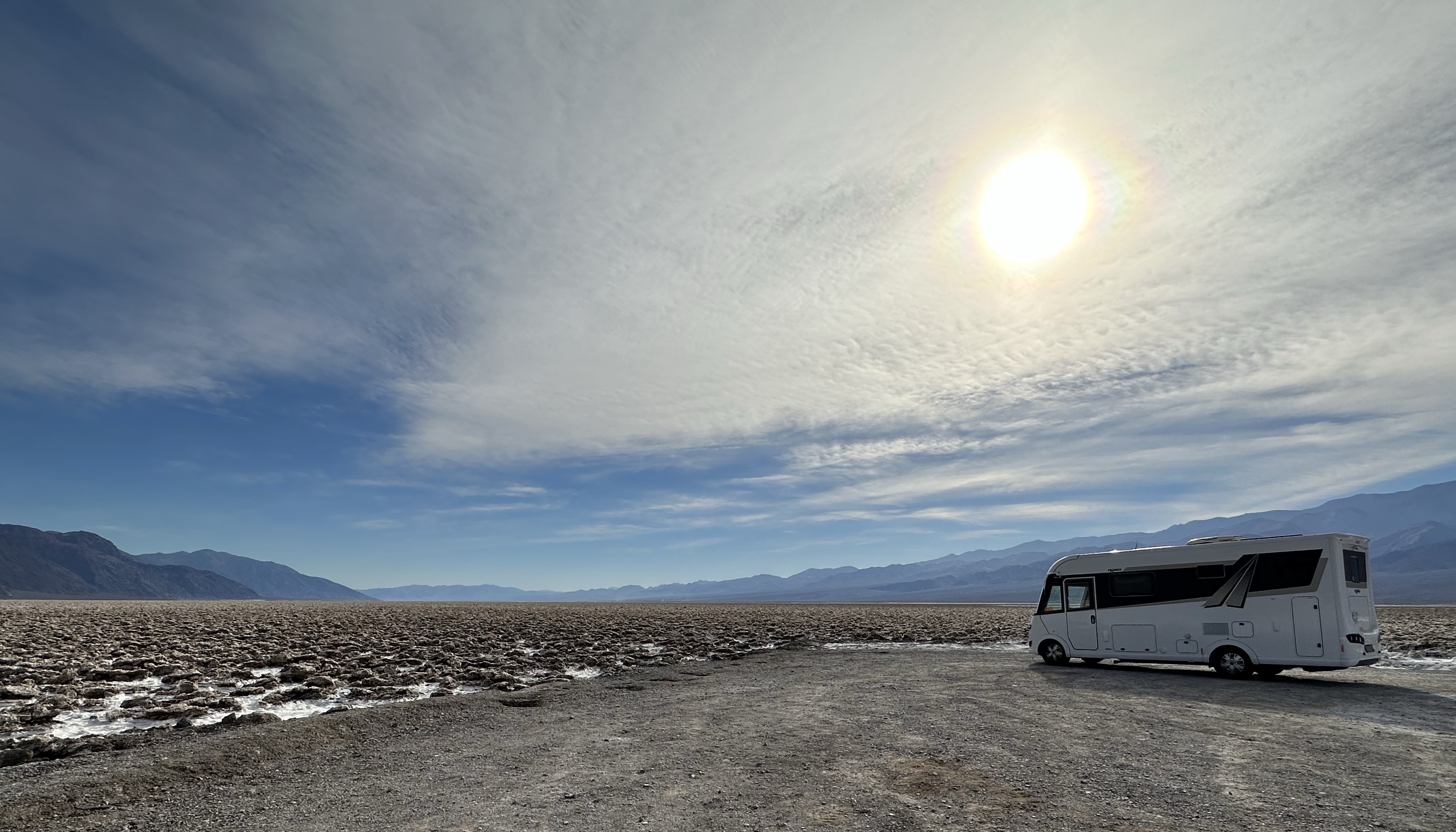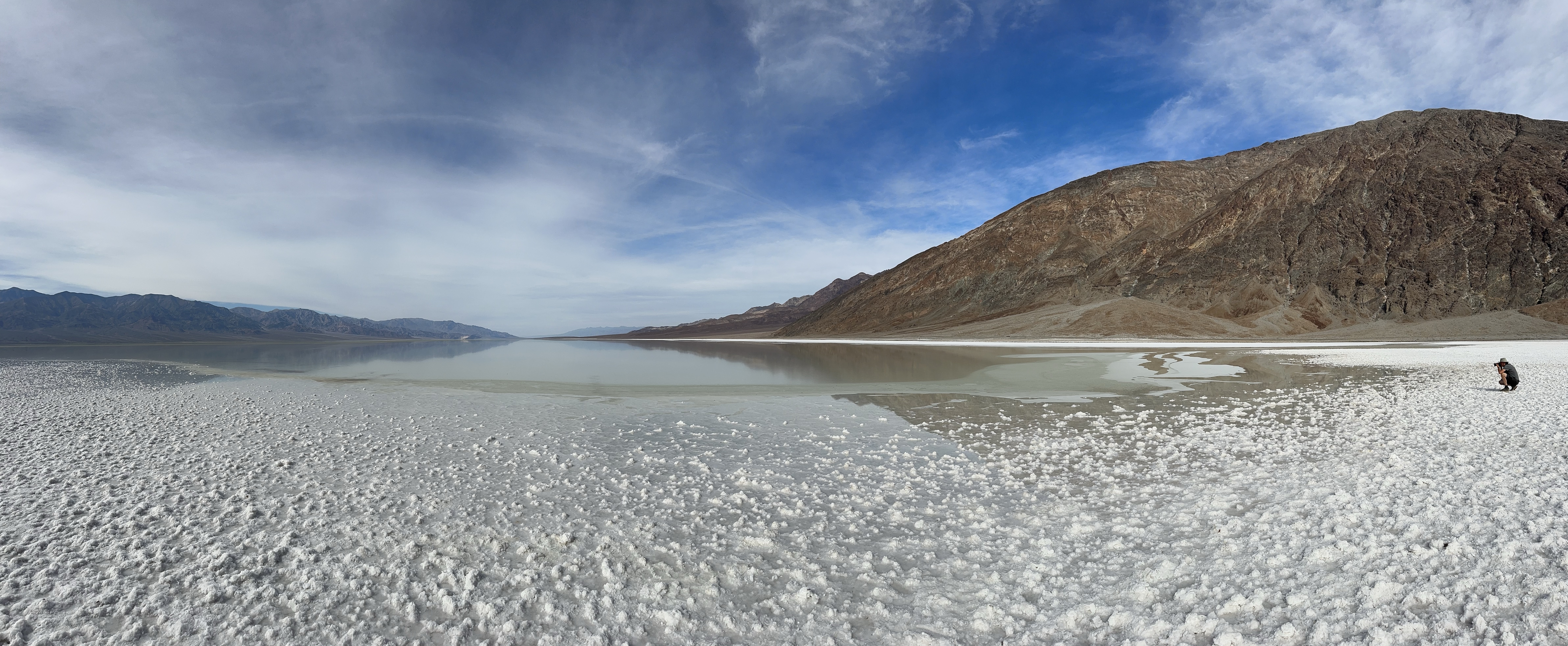 Many of the roads in the park weren’t open yet and some of the main attractions inaccessible, like Scotty’s Castle. However, the flood also created some once in a lifetime phenomena. Bad Water Basin is normally dry as a bone except for a small ‘pond’ but there’s a lake at the moment. One guy we spoke to had never seen a lake in 50+ years of visiting. He too was angered by the ‘ignorant entitled’ ignoring signs and walking in the waters. Their footprints will be dried in for the next 50 years… we see that kind of thing a lot, the Insta Society, photos are priority. Bad Water Basin is 282 feet below sea level and aside form idiots, is an unusual place and stunning, the salts drying and creating beautiful crystallised effects in a stunningly different landscape.