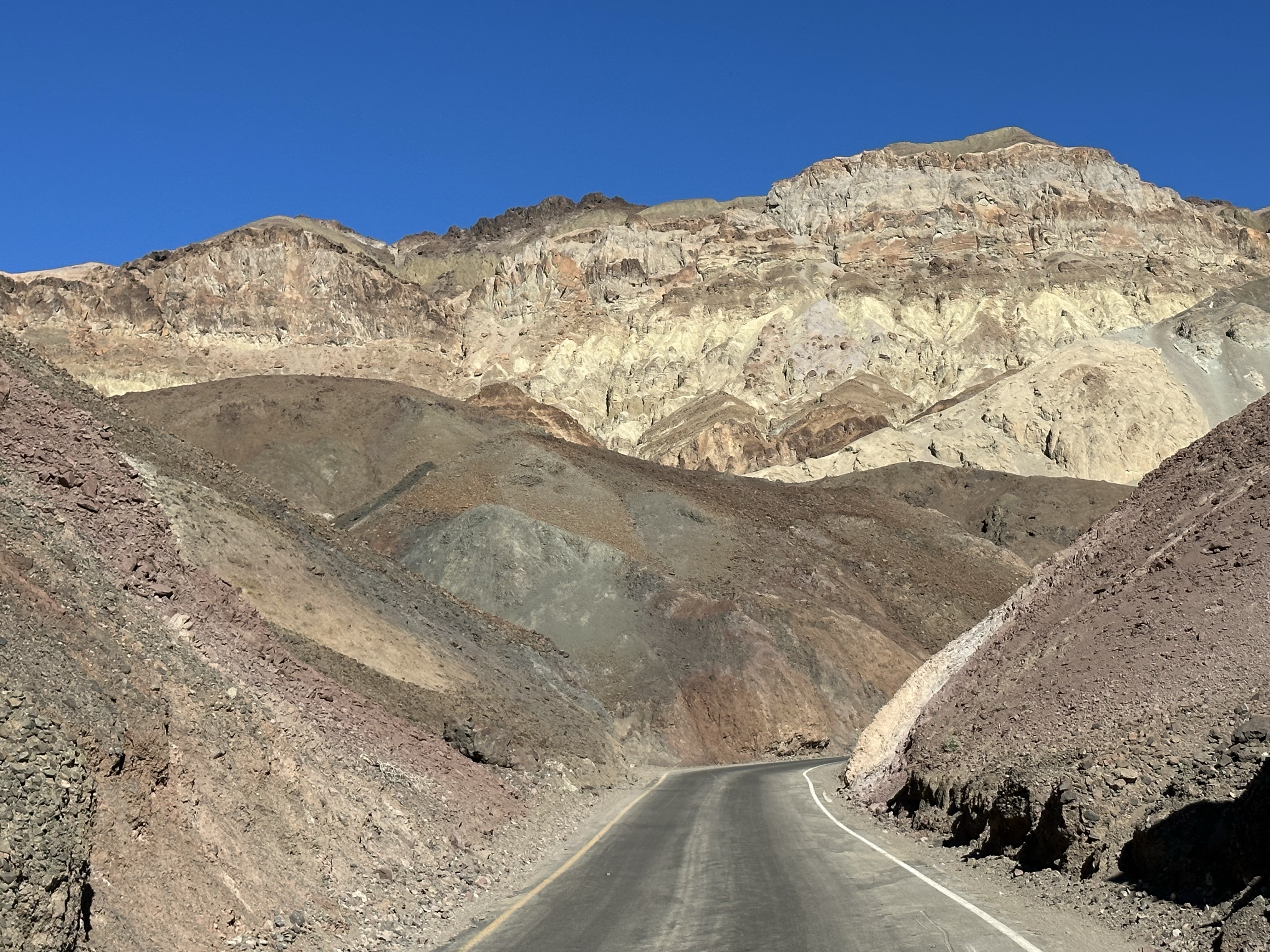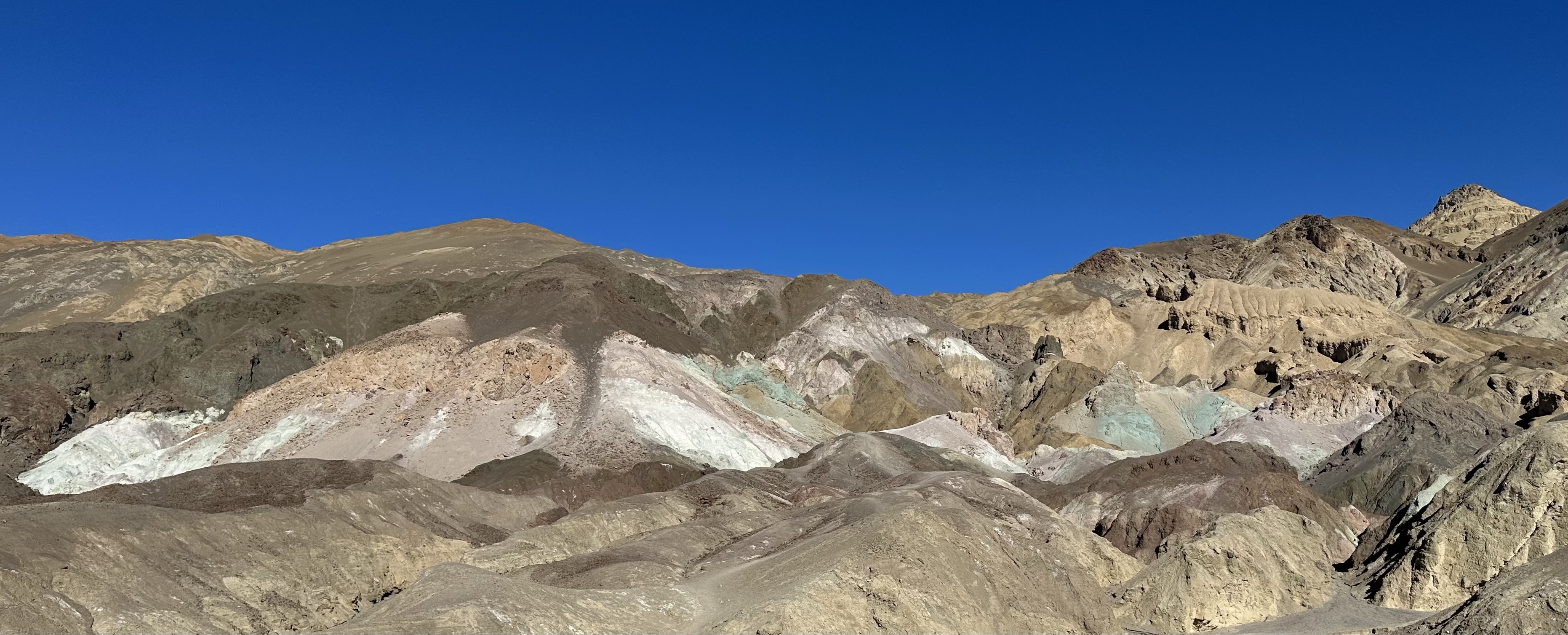We opted to get the bikes out to ride to The Artists Palette, not sure one of our smartest moves but we had enough water so survived the effort and the heat. Lots of uphill is great for the views though, down across the valley floor and to see the shimmering oasis’s in the heat and the white salty earth! The palette itself is one of pastel shades. Volcanic eruptions over 5m years ago plumed ash, laden with different minerals which in time deposited and the colours emerged.