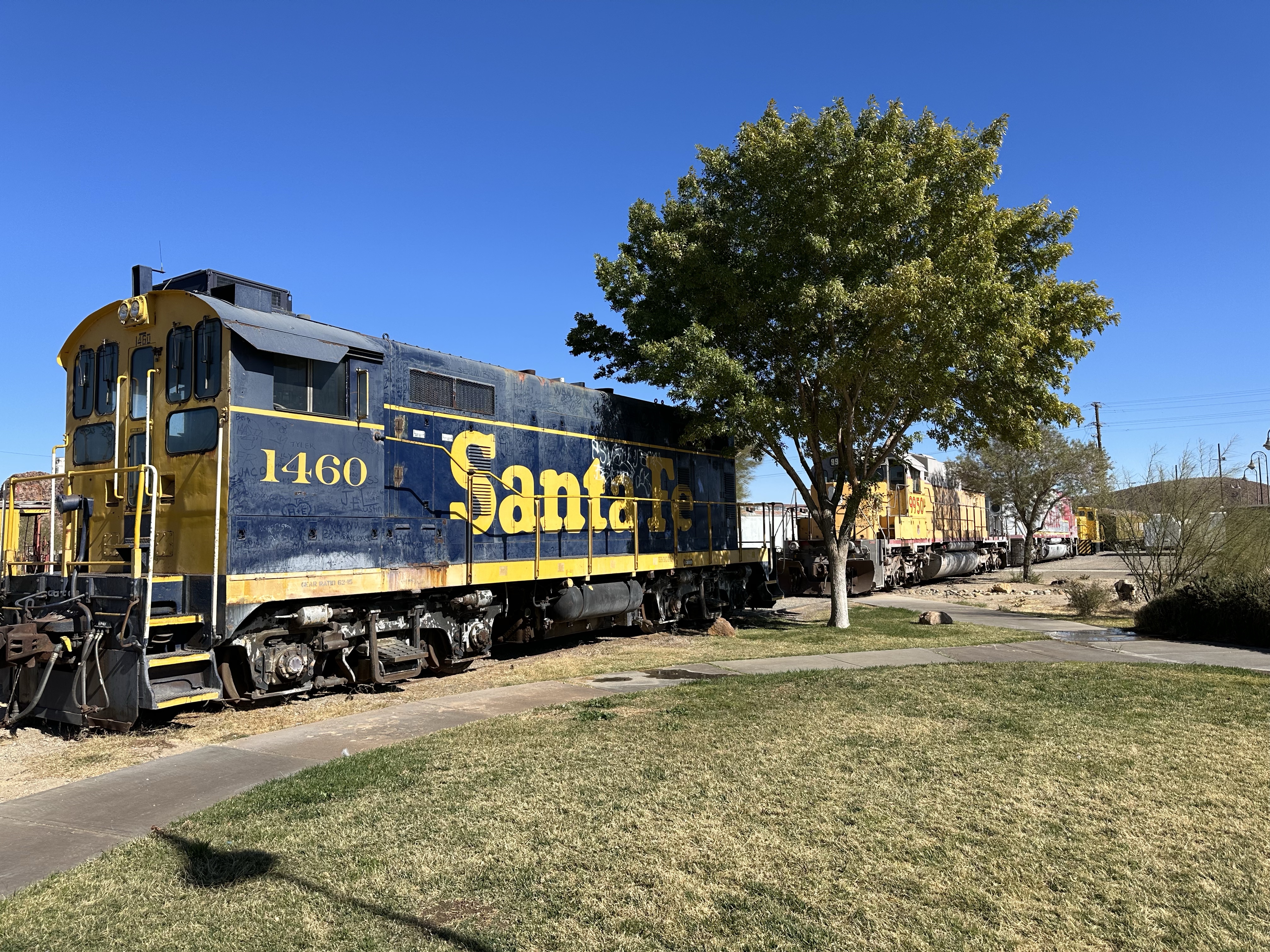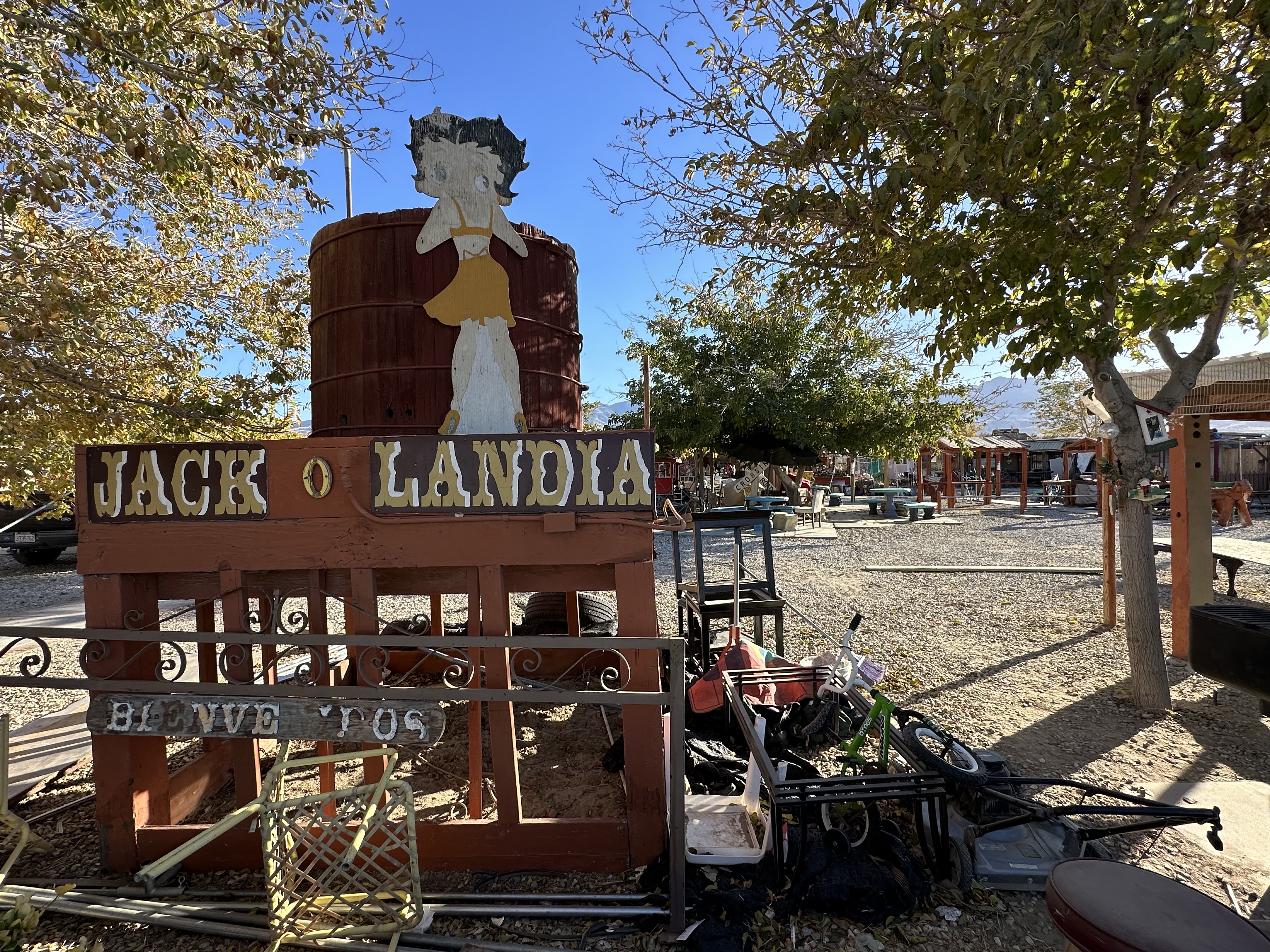 We left Death Valley, a long drive across the desert but seeing the post rain ‘super bloom’ yellow flowers and quite a few dust devils. A short stop at Barstow to see a restored Harvey House, Casa del Desierto, and a number of aging loco’s, Nick got really excited when a 6 loco freight train went past! Continuing on we spotted a ‘Swap Meet’ site called Jack o Landia. Basically a flea market and it was full of some weird and wonderful finds and some colourful people to chat with.