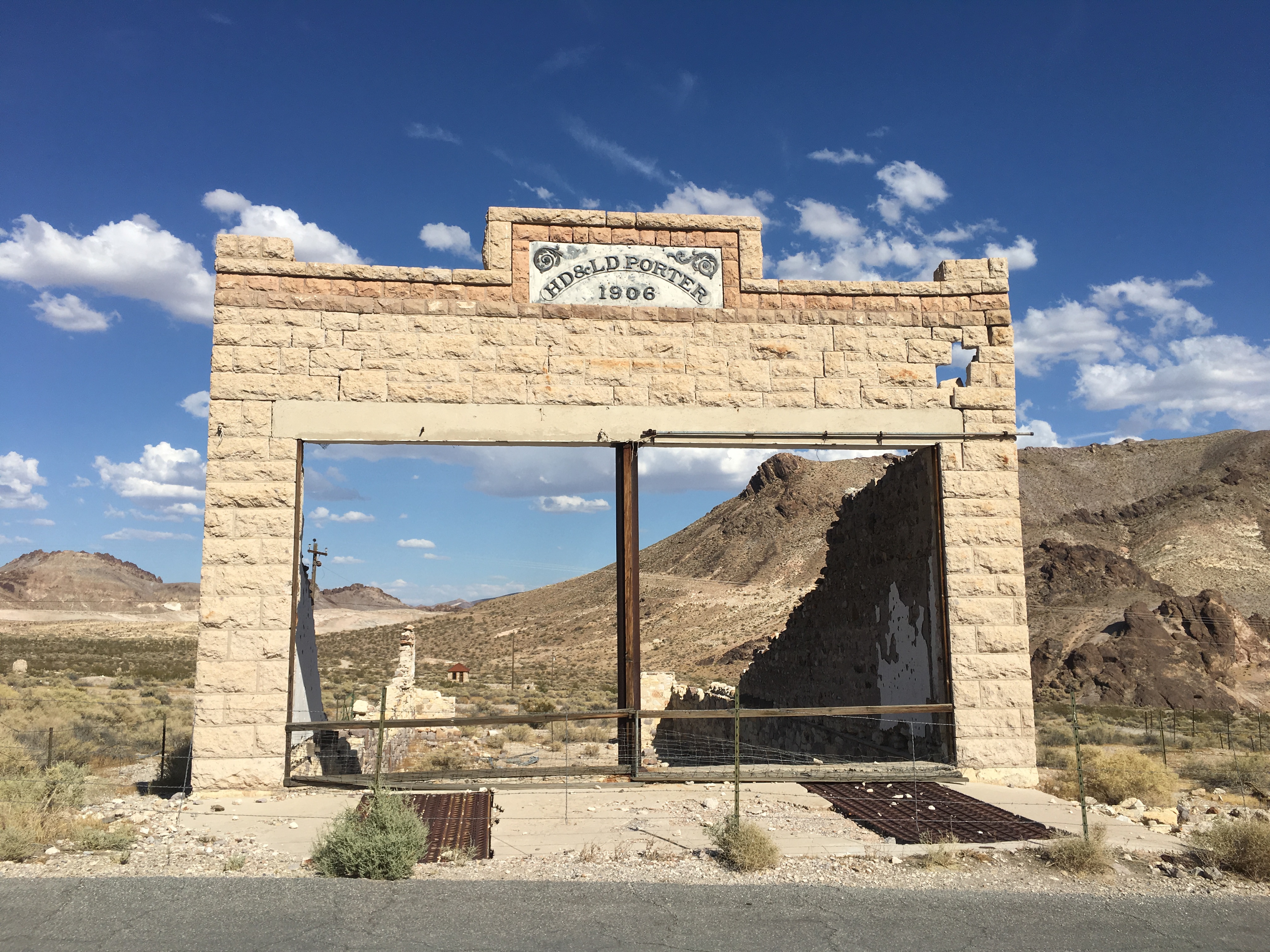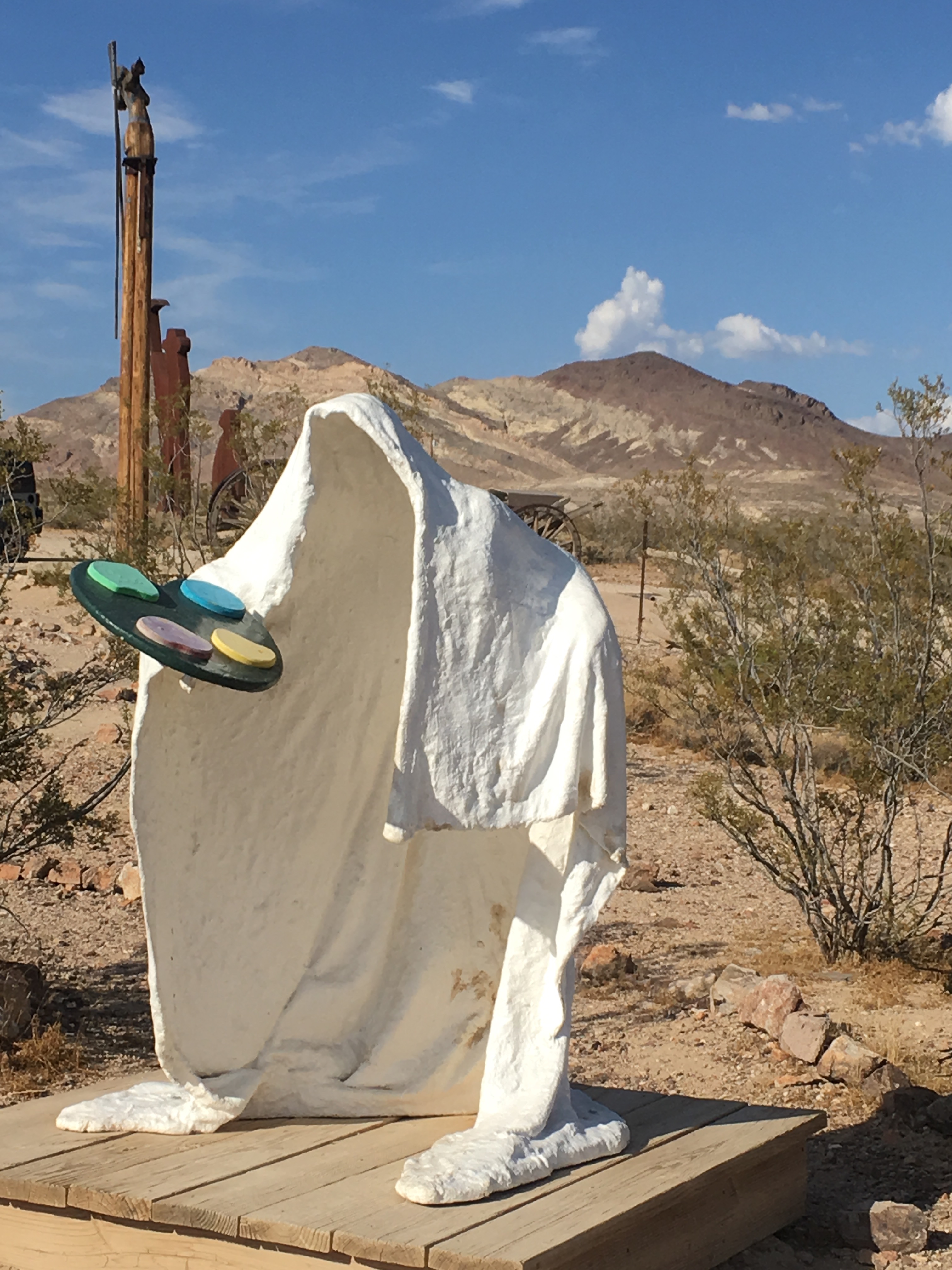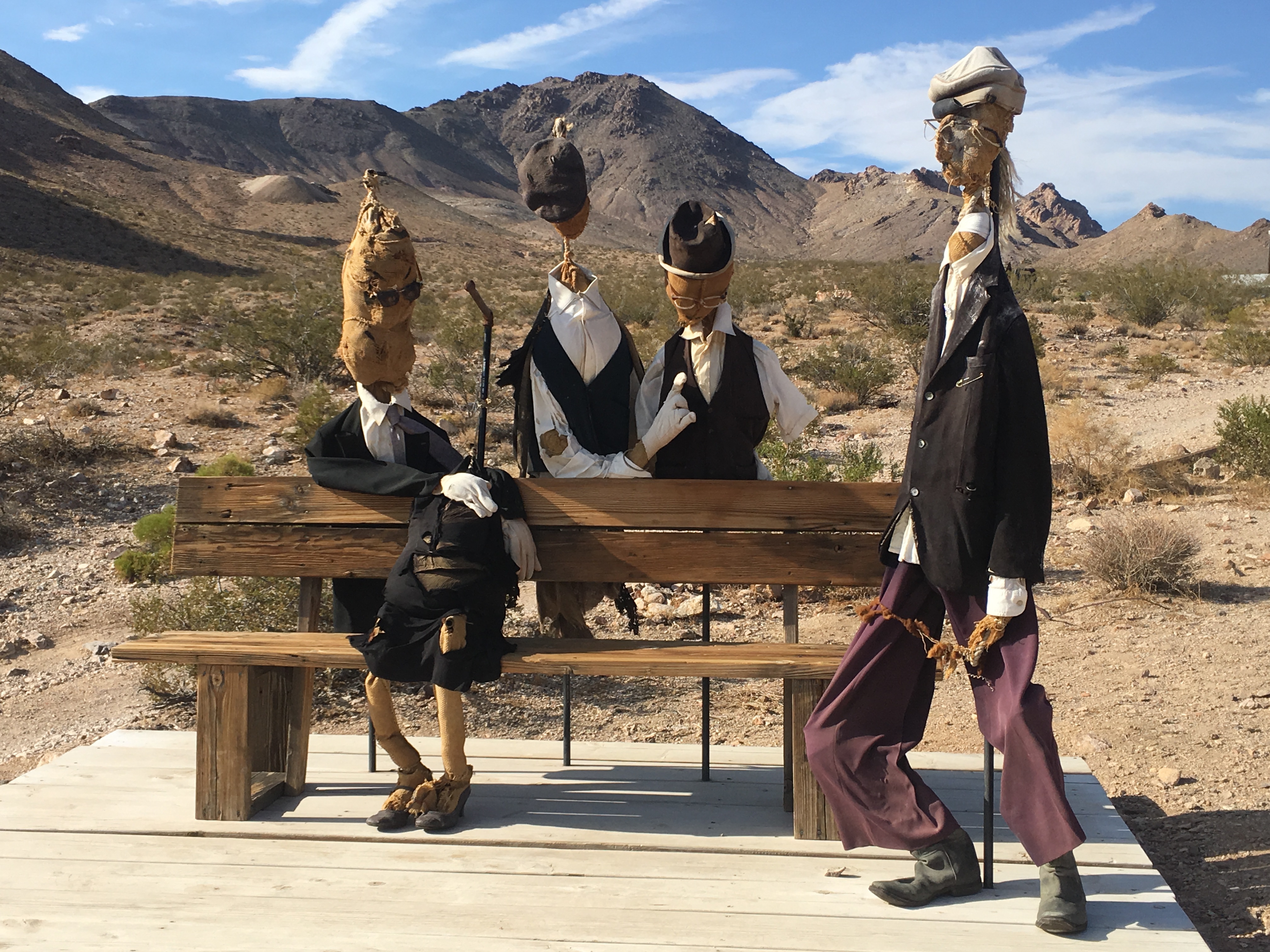 Close by to Death Valley is Rhyolite Ghost Town, the most odd place to ever grace the area. Near the eastern edge of DV park it’s actually in Nevada. Like many, an early C19th mining camp sprung up for the gold rush. One of the best of it’s day, it had electricity, running water, phone lines, a bank, a hospital and of course numerous saloons and ‘cribs’ as they were called, for ladies of the night (not to sleep in I guess!) It declined as rapidly as it grew however and was fully abandoned within 15 years to become a tourist attraction and movie location. What is more interesting these days though is the open air art, such great fun!