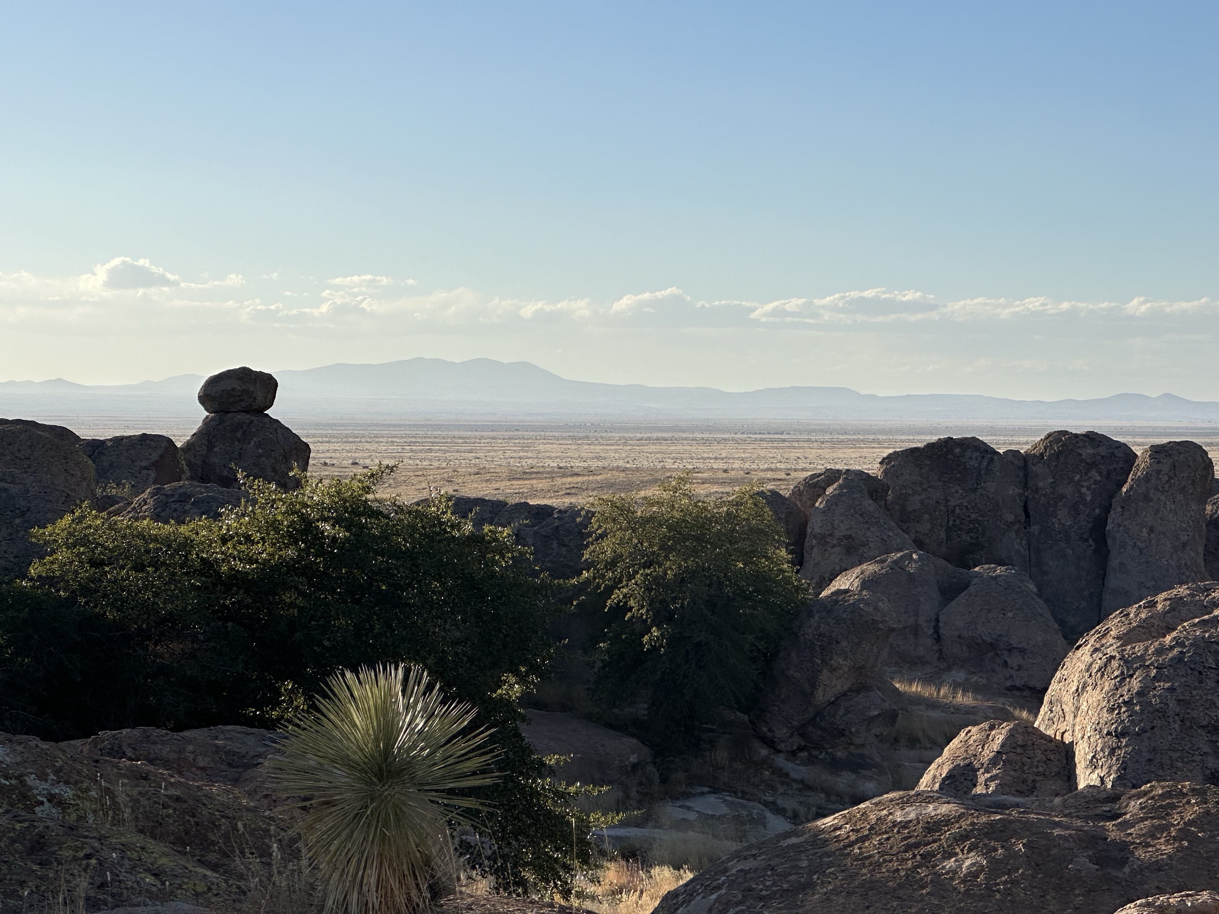 City of Rocks, no not a ‘Music School’ movie, is a unique and wondrous place. Following the Kneeling Nun eruption and a second violent eruption, volcanic by the way, then 35 million years of erosion, the spectacular City of Rocks was formed. The hot ash travelled 125 miles and as the hot ash melded and fell, it cooled, it cracked and shrunk, (known as Ignimbrite or Tuff) giving limestone erosion its opportunity. Fascinating rocks with boulders balancing and rocks wedged between others, eroded towers of rock, it’s a curious sight. Especially so, as this ‘city’ emerges from the very flat plains of the New Mexico high desert and parts reminded us somewhat of Stonehenge. The sculpted gardens of rocks are a great walk and a long trail leading away from them, through the yucca and cacti, gave a super perspective. Not only was the landscape surreal, we had a glorious clear sky, shooting stars and noisy coyote for the evening. Can you spot the van?