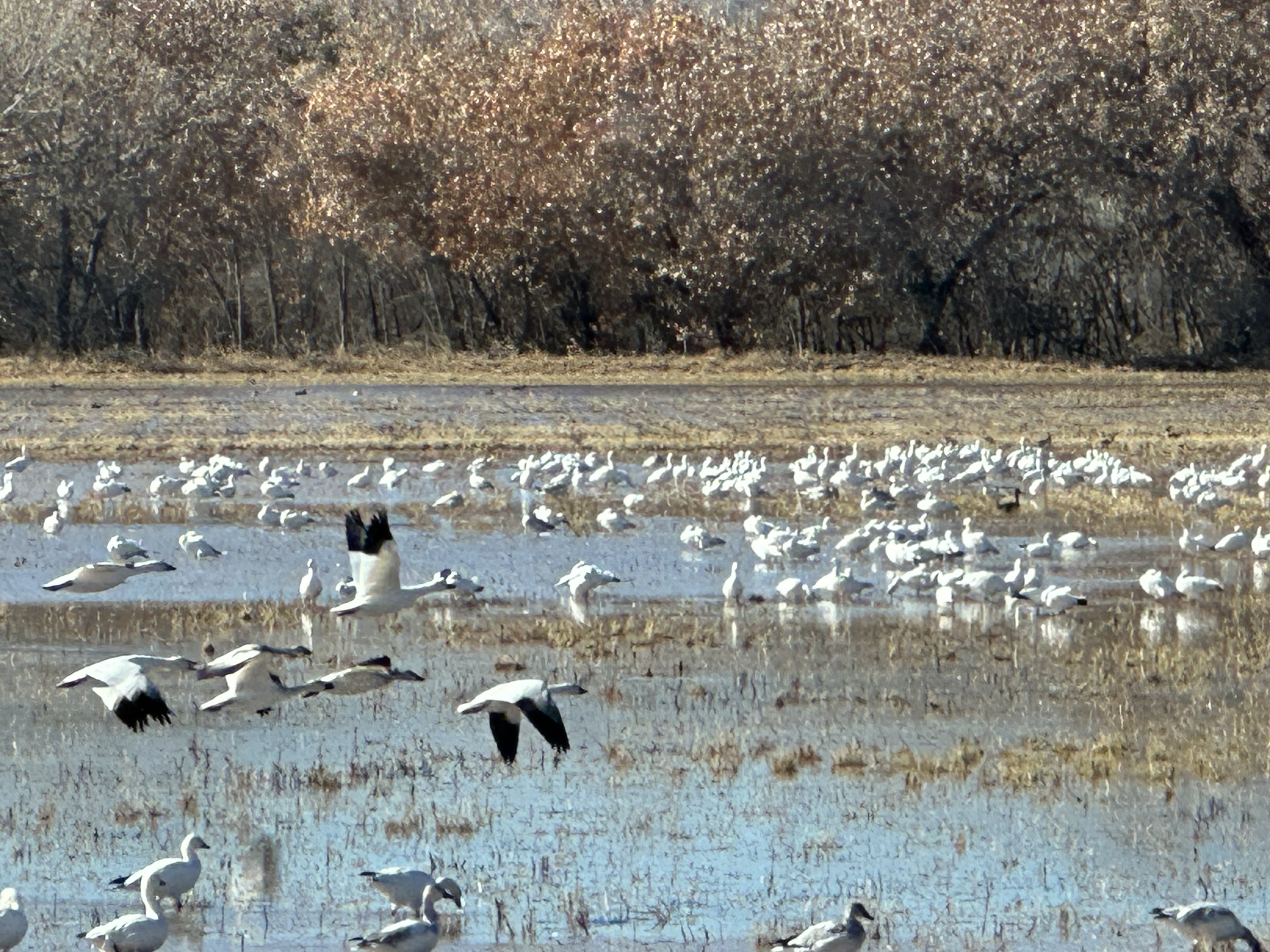 Not necessarily easy to photograph with my phone, many of the close up (zoom lens) bird pics are back of Nicks screen. It was a wondrous place and worth the 6am starts and -7deg temperatures to see. There was frost on the ground, ice on the water and a stunning sunrise. The ‘Performance of The Snow Geese’ and ‘The Density of the Ducks’ as we named the events. Also, just driving around spotting and trying to identify is part of the fun and as we said ‘If you don’t look you don’t see’. We like it anyway and learn from experts with lenses bigger than Nicks!