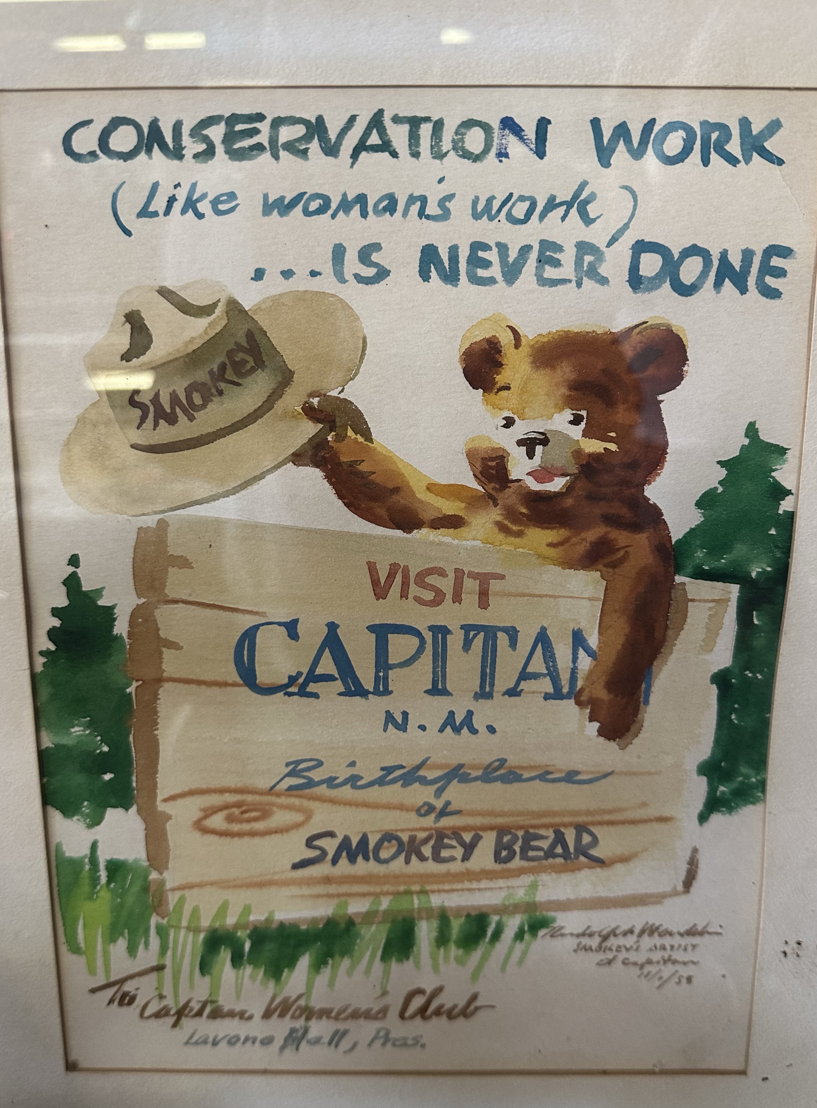 From Bosque we headed to Valley of Fires Recreation Area and headed to Smokey Bear’s home patch. No kidding! The Smokey Bear Museum is in Capitan and it was during The Capitan Mountains fire in 1950 where he was found clinging to a blackened tree trunk and rescued. The rest is history as he became the iconic mascot of Fire Prevention. There’s a memorial garden with a statue to him (he died in 1976 shortly after retiring, all Federal employees have to retire at 70 which is 25 bear years!) There was a gift shop with lots of Smokey memorabilia… what a legend! Some of the memorabilia was of it’s time, fair enough, note the poster about ‘woman’s work’!