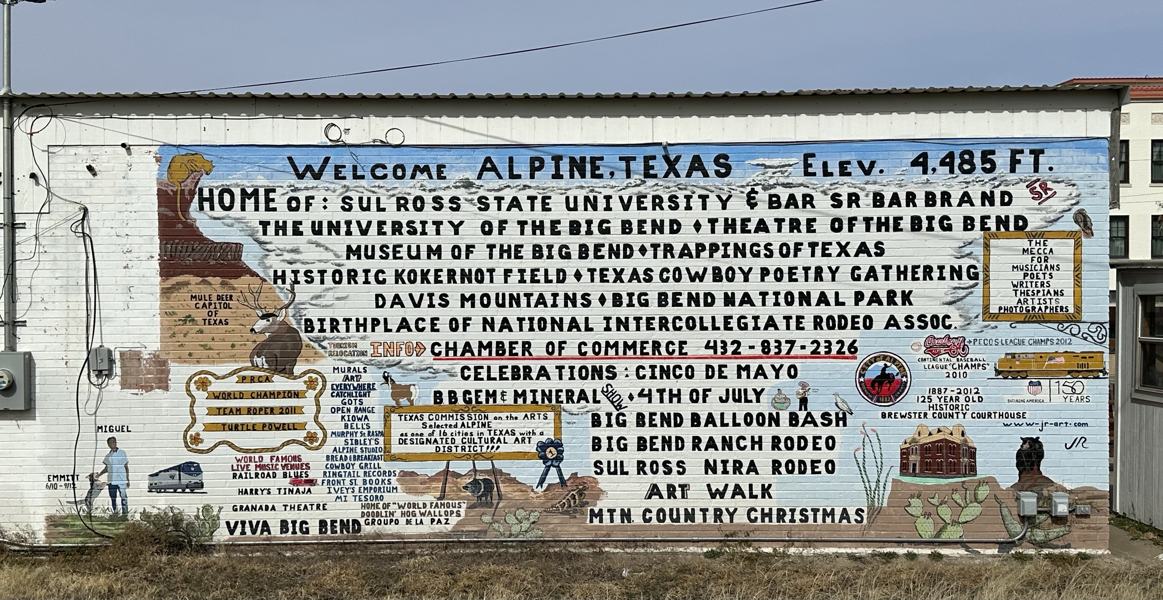 We much preferred another town called Alpine, it had much more about it we thought, and we ‘felt it’ a lot more! 🙂 Home of the first ever Rodeo University, Sul Ross, we knew we were in for a ride! You’ll know by now we are fans of the street art and Alpine has it in abundance and some real quality to it. We stood in awe at the faux Beatles Sgt. Pepper’s Cover with local Texas artists images. Lots of great buildings to see reflecting the history. It was one of those ‘wrong side of the tracks’ towns once upon a time, when Hispanics couldn’t go North side after dark, segregation rules. Naturally, the South side was thus the more vibrant side of the railway. The area is now regenerated, Murphy Street and even has a cat hotel.