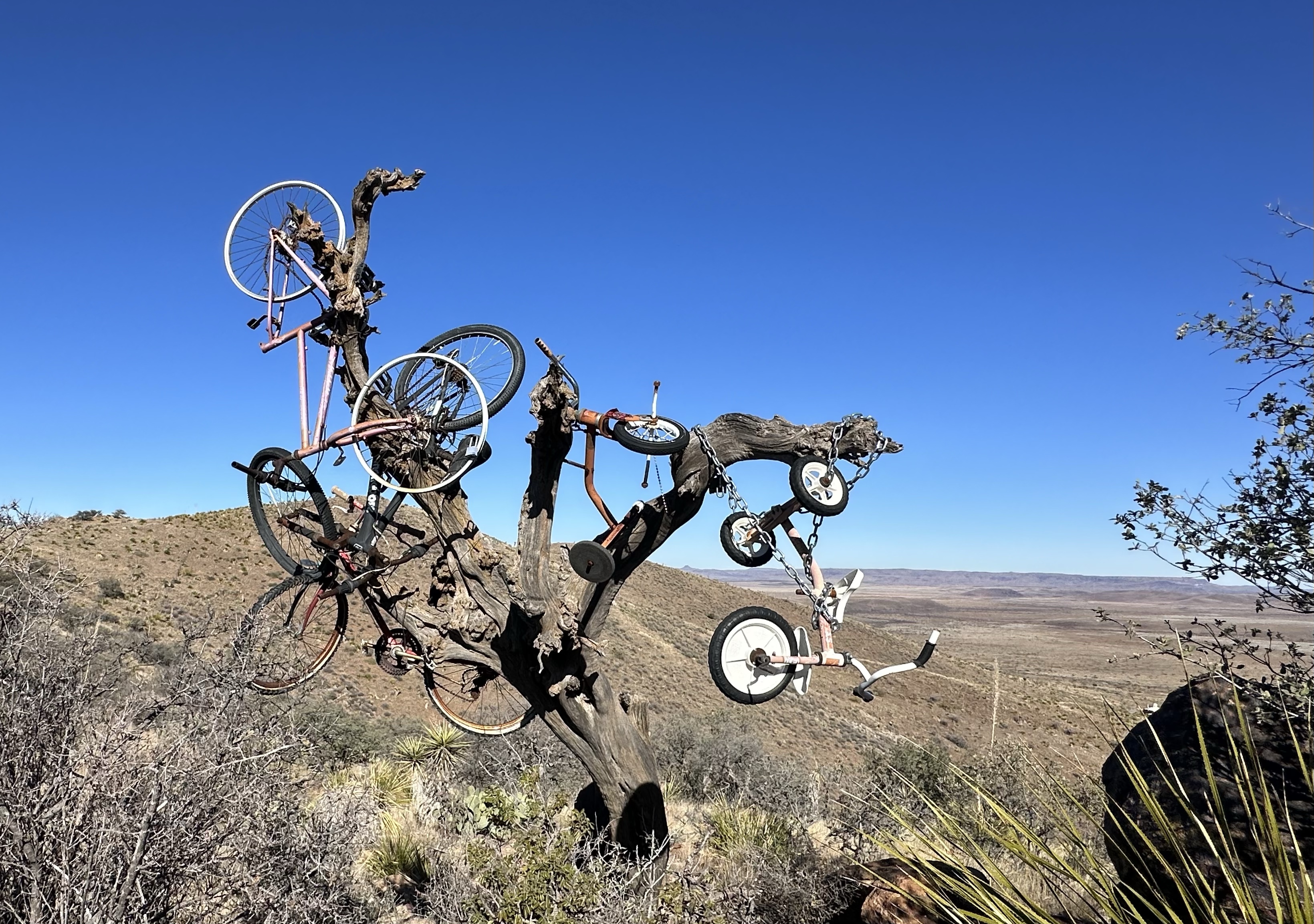 Alpine was also a great overnight spot; we camped with 3 kangaroo, 3 alpaca, 1 llama, numerous donkeys, a camel and a partridge in a pear tree. Jigsaw had a different opinion… fantastic boondock hosts! The following day we took a hike as we needed to do a bit of admin, we found an empty desk atop a mountain and thankfully there were some bikes we could ride down on. Seriously, there is a desk at the top and bikes hanging from a tree. The desk put their by Sul Ross students in 1981 who wanted a quiet place to study.