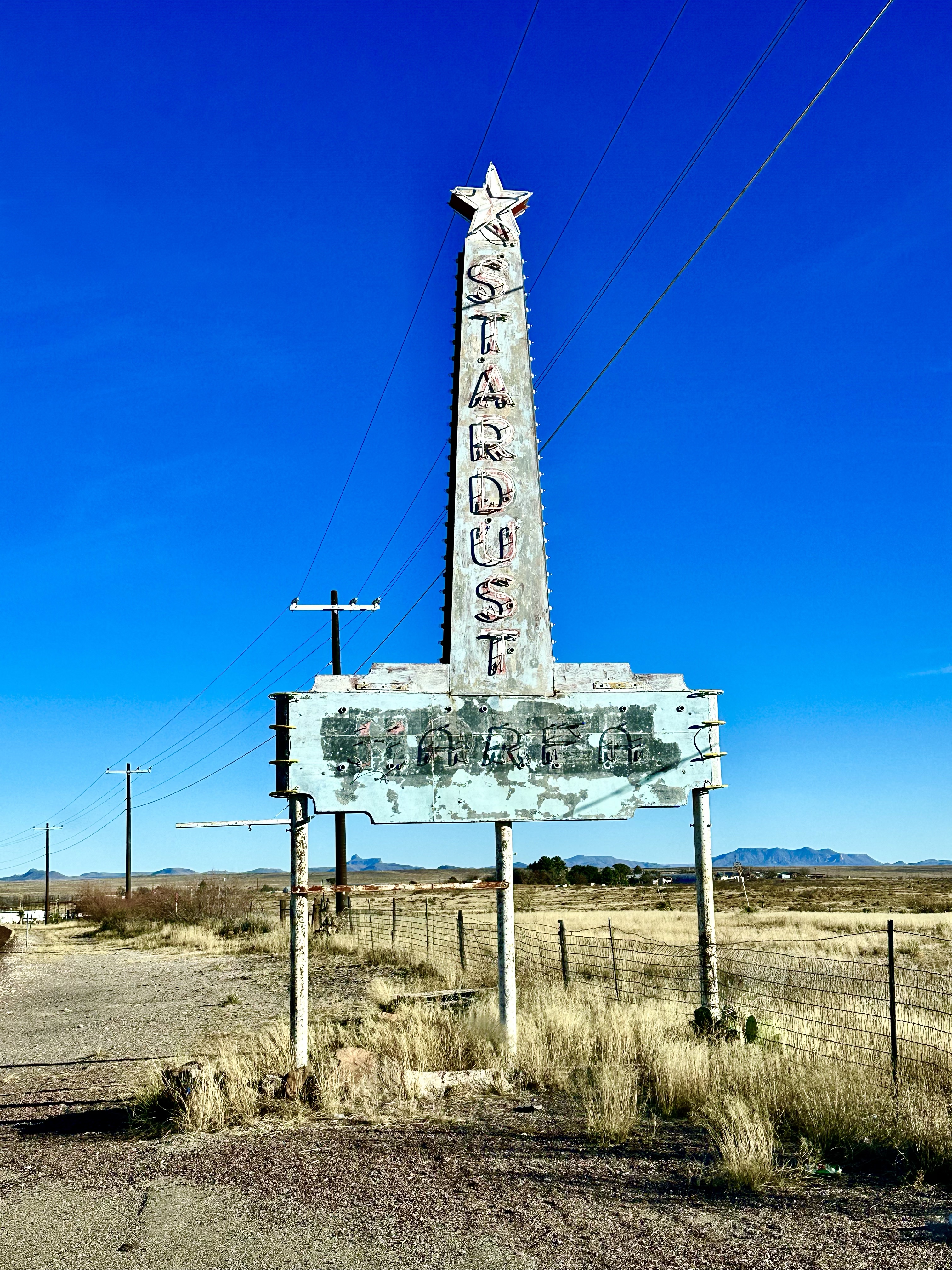 We headed towards a town called Marfa, a name that sounds like it’s out of some sci fi film. It was an little known small town until artist Donald Judd decided to base himself there and thus, the cyclical evolution of artists and art lovers to the area. Before that, it was known for being the filming location of the film Giant, James Dean’s last. Hence the ‘giant’ painted plywood cut outs roadside… wasn’t she just gorgeous, our Liz? These days it’s the Prada Marfa store in the desert that it is known for, its not real but draws people who then say, “I knew it was dumb but I went there anyway”. For a small town, its architecture is grand and there’s a fair few arty shops and galleries and some overpriced shops for the discerning visitor. We thought it fun to park our palace in front of the palace! To be honest we weren’t quite feeling it, (we keep hearing that phrase!) and aside, we weren’t in the customary boho attire of designer cut off jeans and ankle boots. We’re more hick than hip!