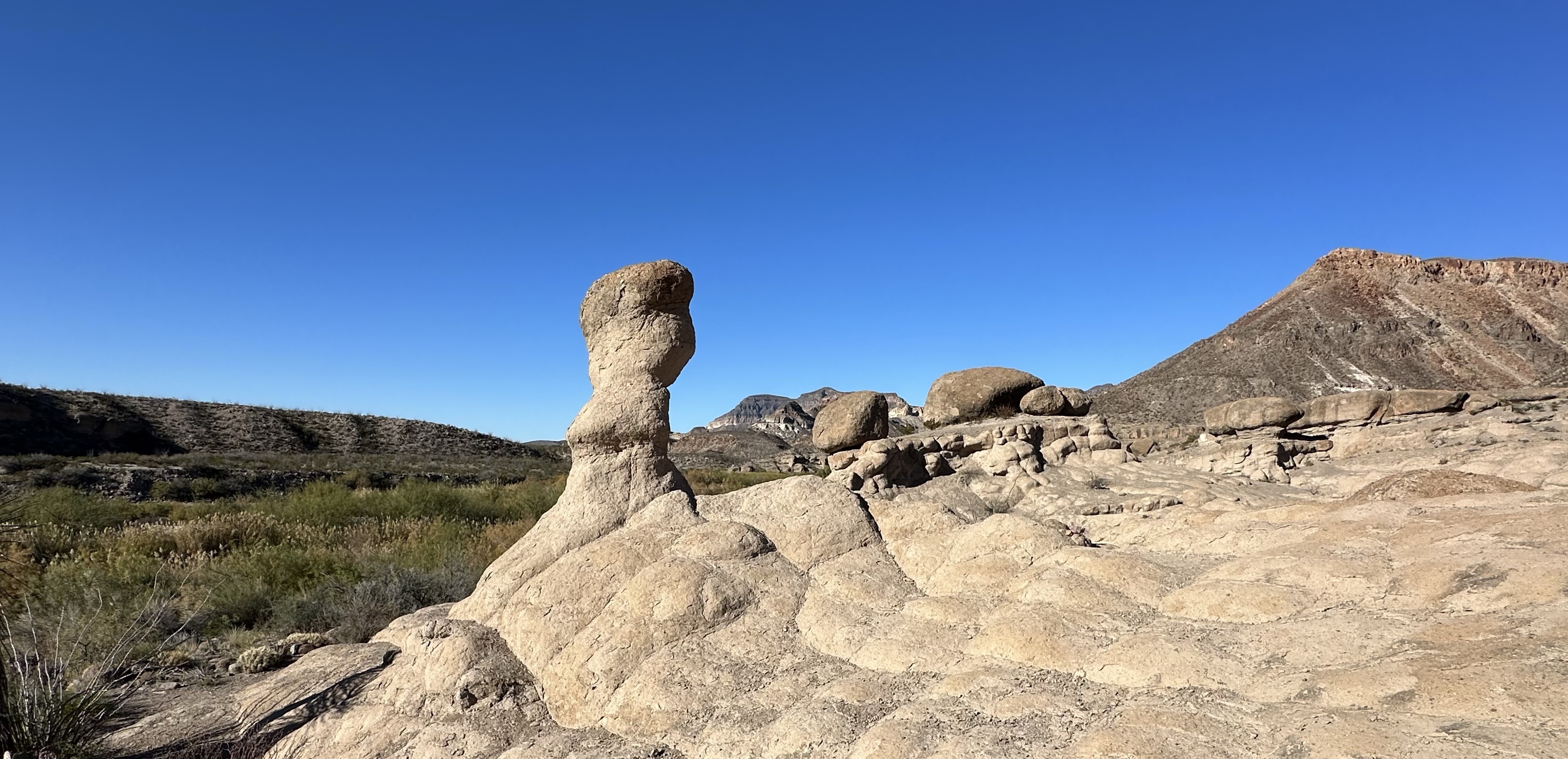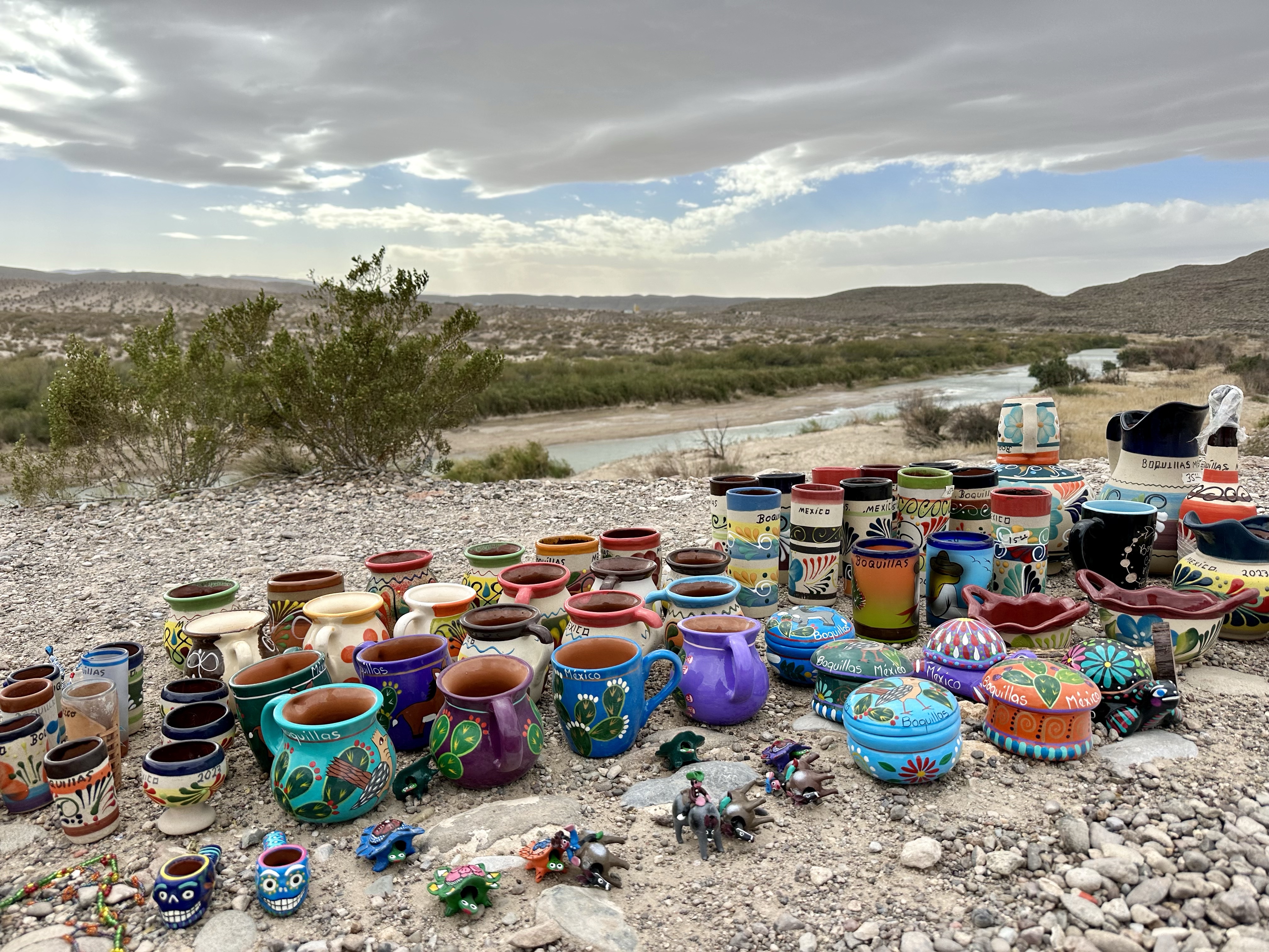 Towards the east of the park it is different again. Remaining close to the Rio Grande again, we could hot foot it into Mexico on a hike at The Boquillas Canyon, with the wild horses, where the landscape changed again, sandstone eroded hoodoo forms and a lusher feel. At every turn there were Mexican crafts for sale, adding a mass of colour. In the evening sunset light atop a mountain, the rock of the Sierra del Carmen turned pink (on the Mexico side) and the sky pinks and orange, US side. The Cottonwood tree’s and grasses vegetation, back lit on the river flood plain were mesmerising in the breeze. The Sierra is on the scale of The Grand Canyon, with its steep sides and escarpment edge, and just as stunning, rising out of the Chihauhaun Desert in Mexico the range is 72 km long Walking through a nature trail nearby, in what is in effect a desert oasis, we saw a Javelina and a Coyote (note to selves, Jigsaw needs to be supervised in the campground!) We didn’t spot the bobcat that’s around!
