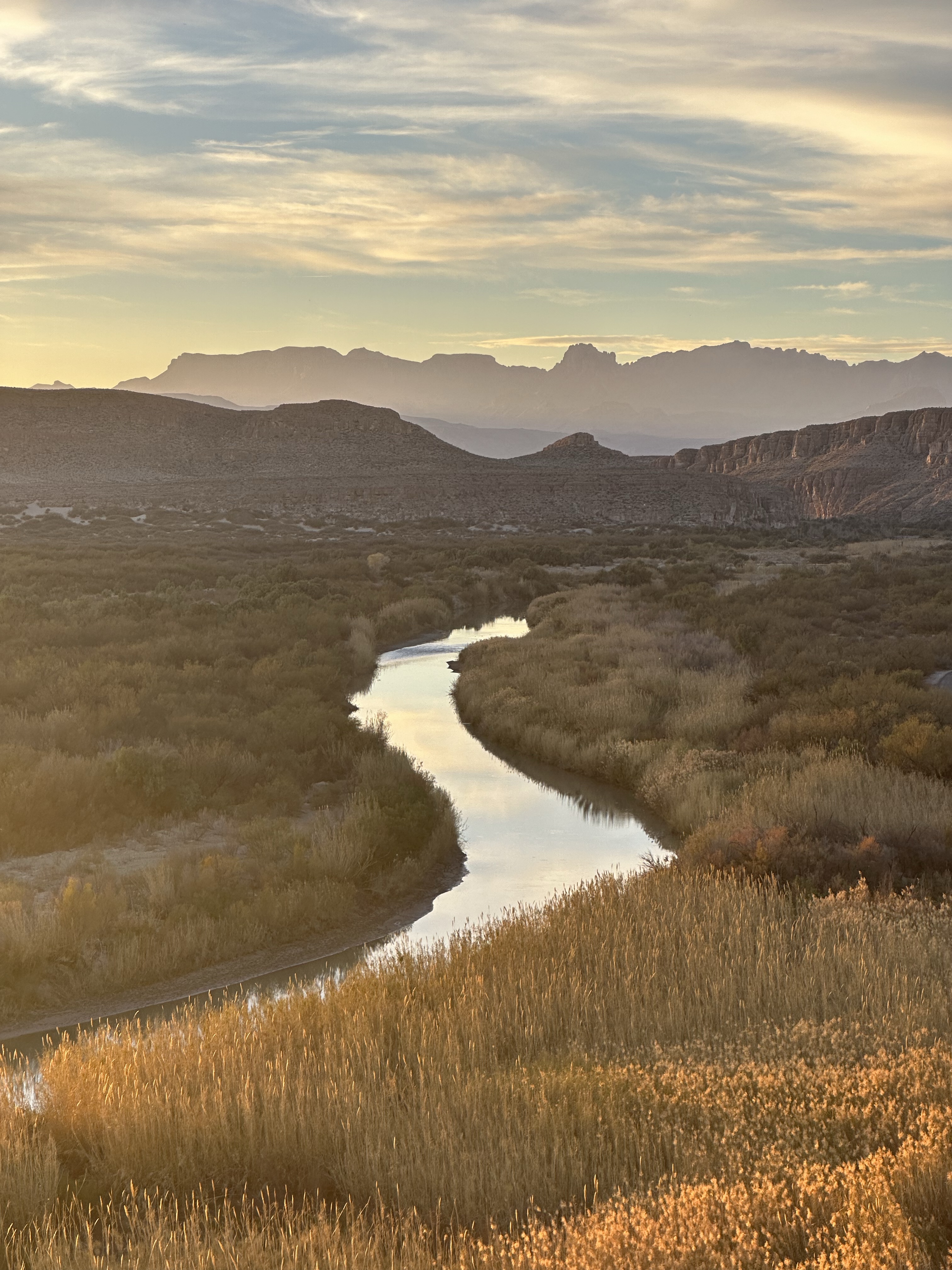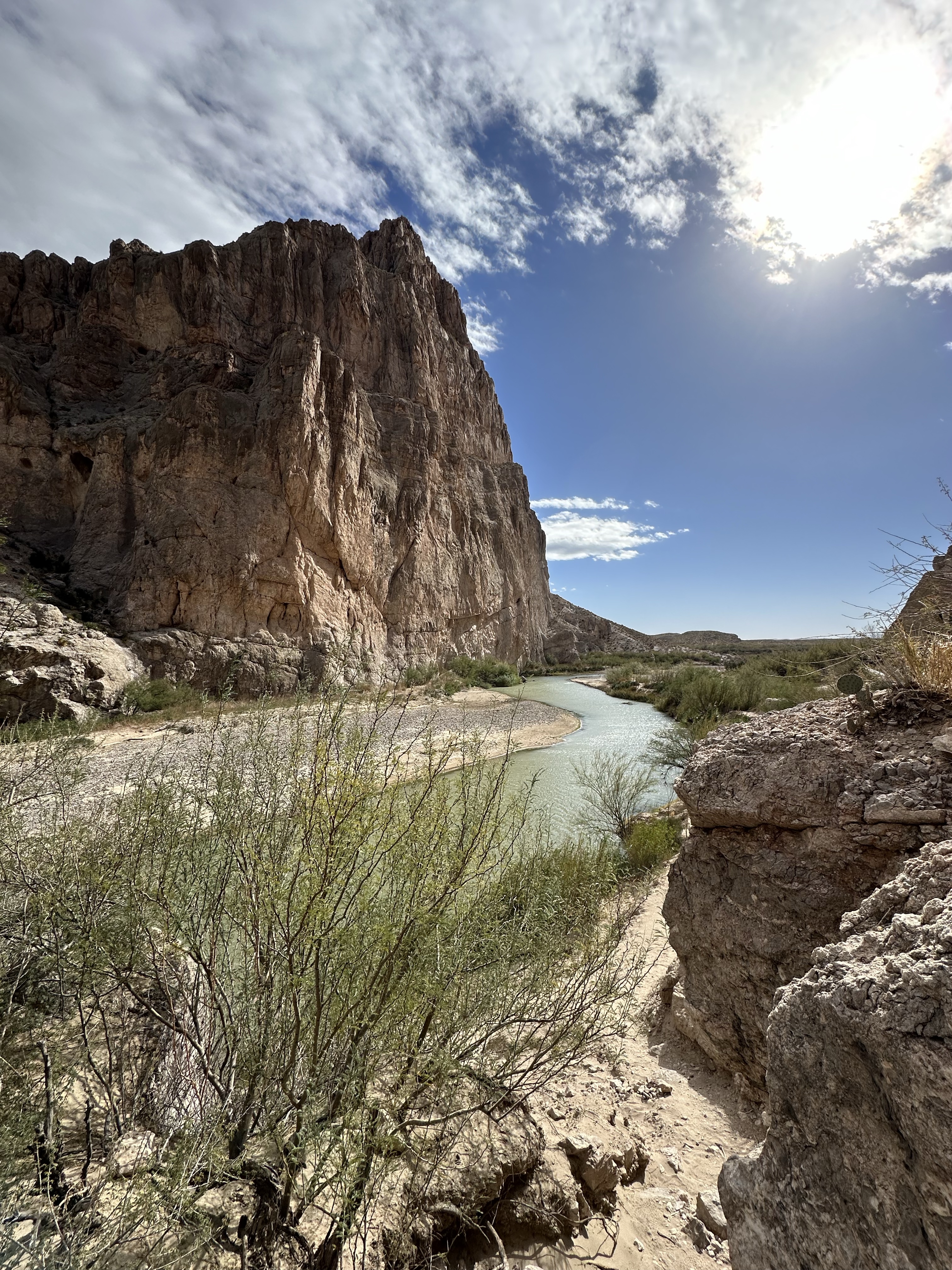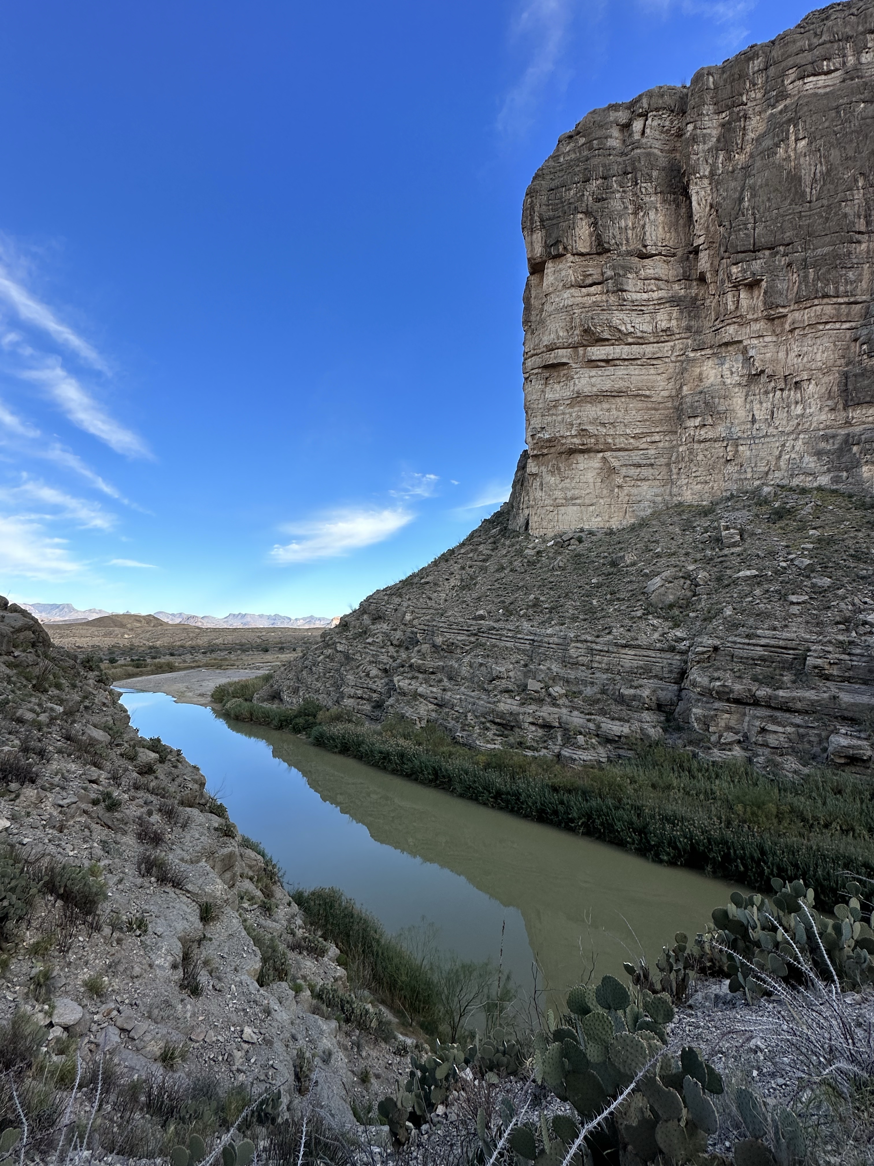 Big Bend National Park, founded in 1944, is vast and thus we stayed in 3 different parts, each quite different. At 1,252 sq miles it’s just a tad smaller than Cornwall. A scale like that equals diverse landscapes and all of it immense. Some parts really hug the Rio Grande, Big Bend being named as a result of the 90degree turn that the river does, within the park. We were really surprised at how low the water levels were, such that we could literally stepping stone into Mexico. Apparently, the river is dammed several times up stream to provide water for the populations of the big towns and cities. We wondered what happens when it’s totally dry as it doesn’t seem far off! The Santa Elena canyon was a great hike, we could throw rocks at Mexico, just like the US seems to do with words (based on conversations and attitudes we’ve come across so far)