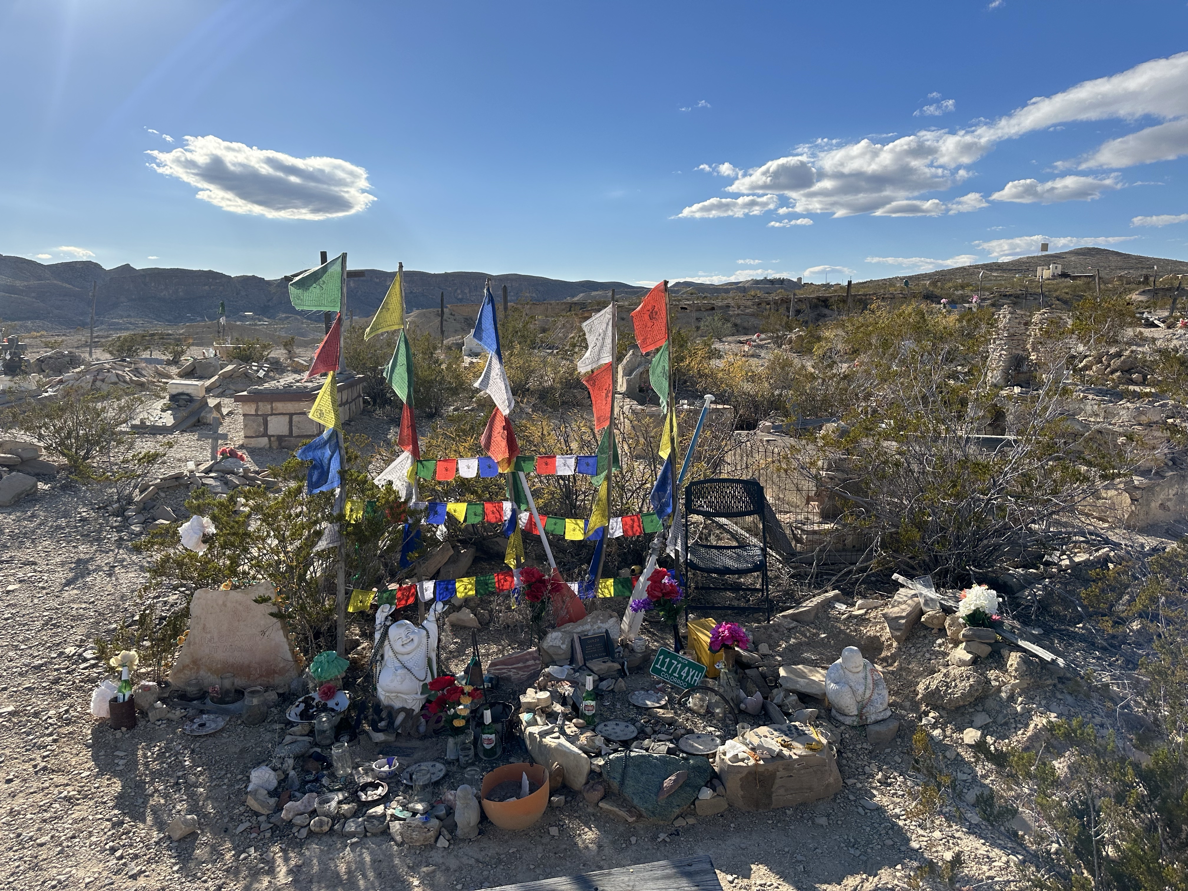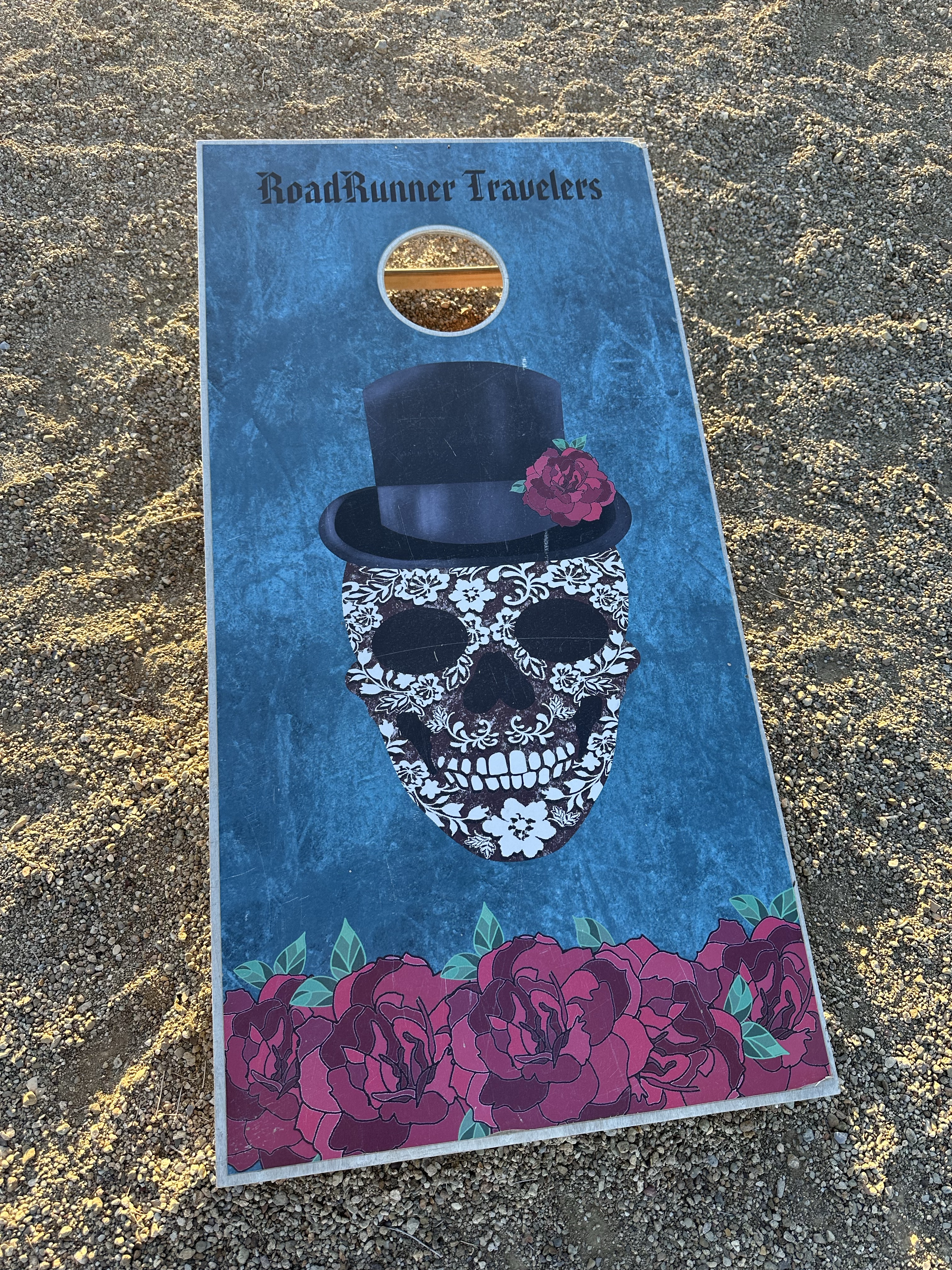 On our way to our campsite we stopped at the so called ghost town of Terlingua. It says a lot about a place when the most interesting bit is the cemetery! Not a mercury mining ghost town at all these days, it’s full of old 60’s and 70’s RV’s and Airstreams masquerading as Airbnb’s, has a really busy restaurant, bar and music venue and a tourist tat shop. At least they have a fiesta recognising Day of the Dead on Nov, 2nd to keep it real! On that note, the ‘cornhole’ boards at the campsite, we’ve learned the basics of the game, were very elaborate.