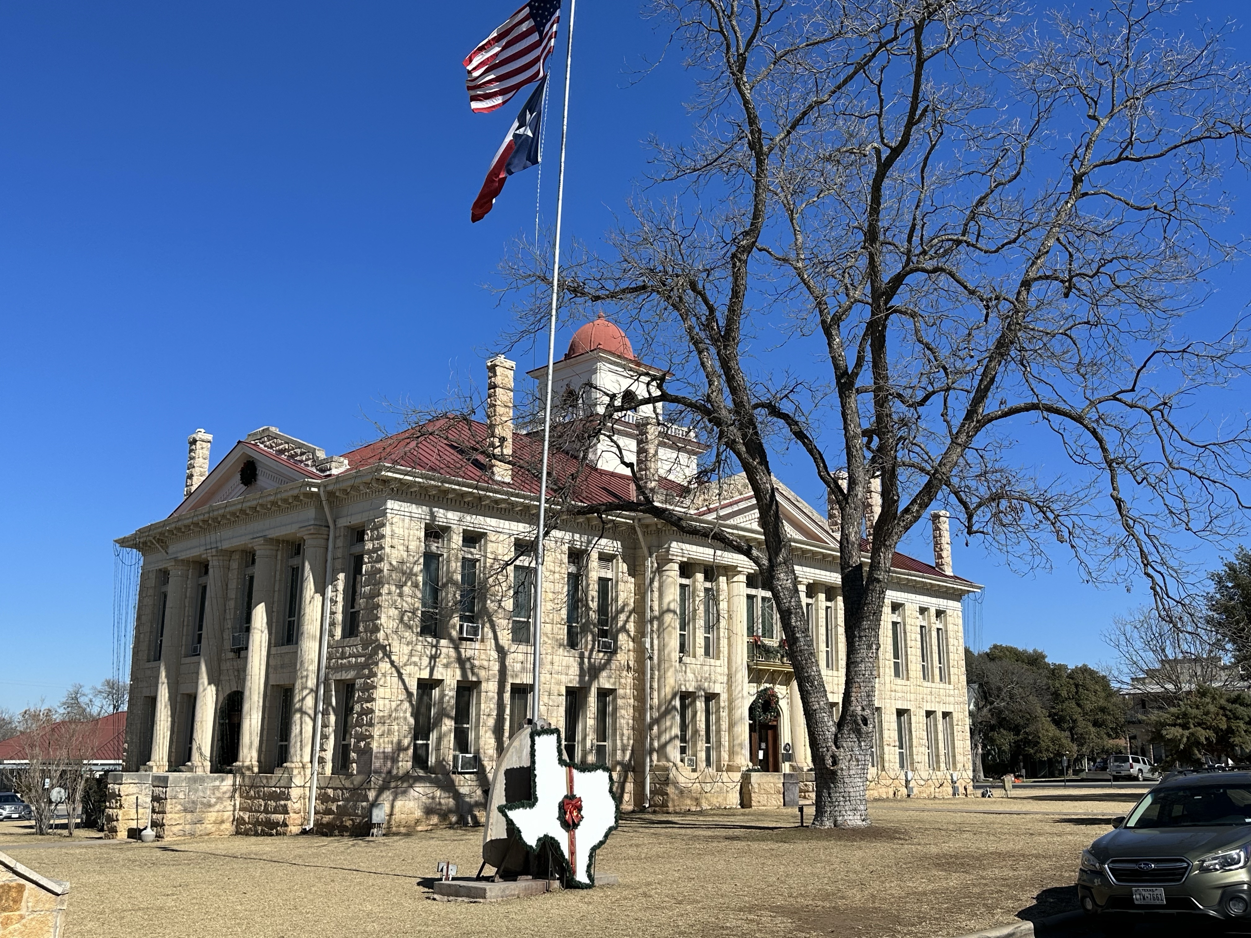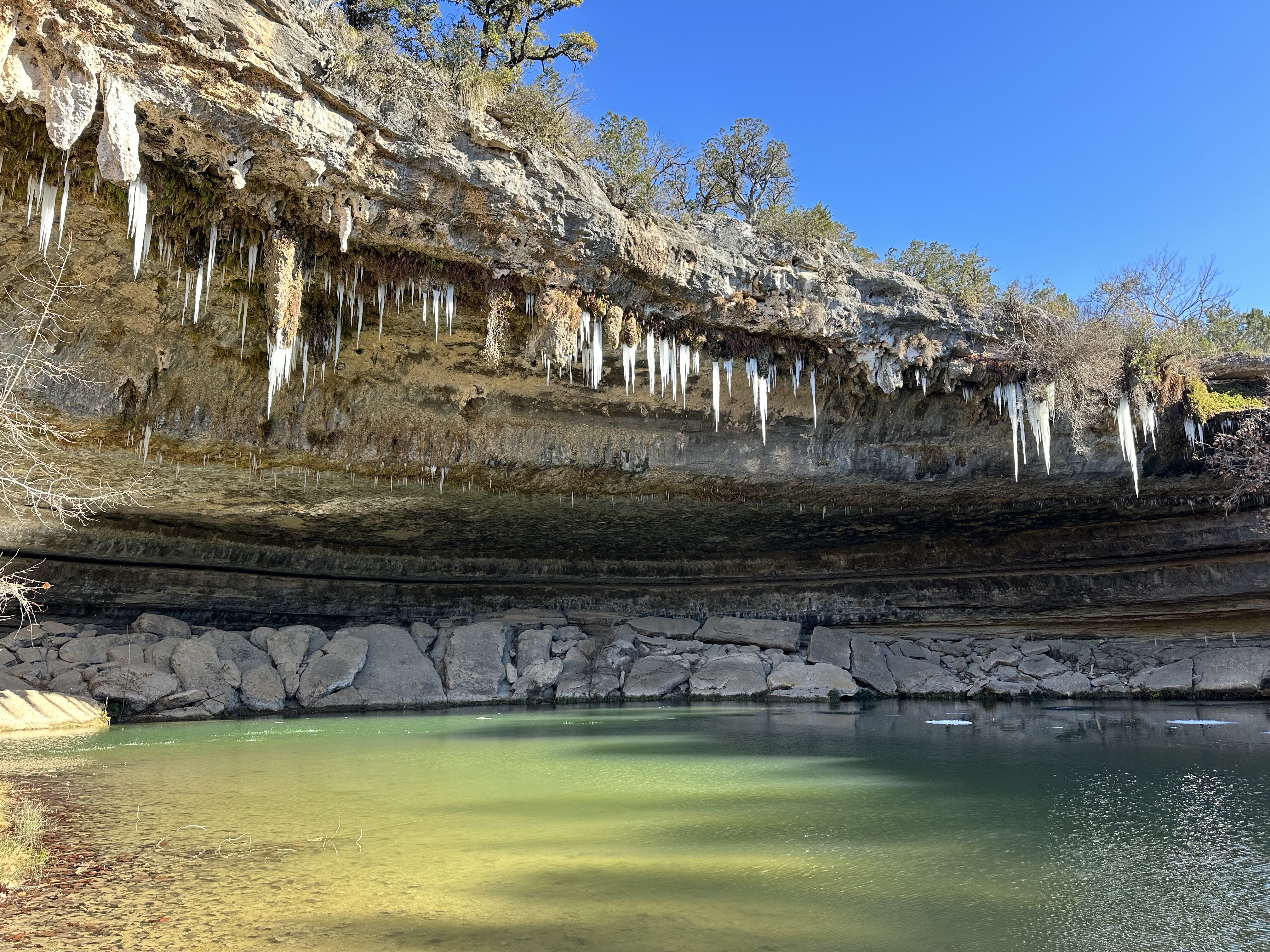 Still uber cold, we wandered Johnson City, which actually isn’t named after LBJ but Sam E Johnson Sr. In Blanco County, Johnson City became the county seat in 1879, no doubt James Polk Johnson donating 320 acres helped with the naming convention! The fab 1916 Blanco County Courthouse dominates. Willie Nelson gets everywhere in these parts! From there, a short hike to Hamilton Pool was stark in it’s contrast, the magical waterfall had frozen in the cold and we stood for an age watching melt drips and the occasional snap and fall of the icicles.