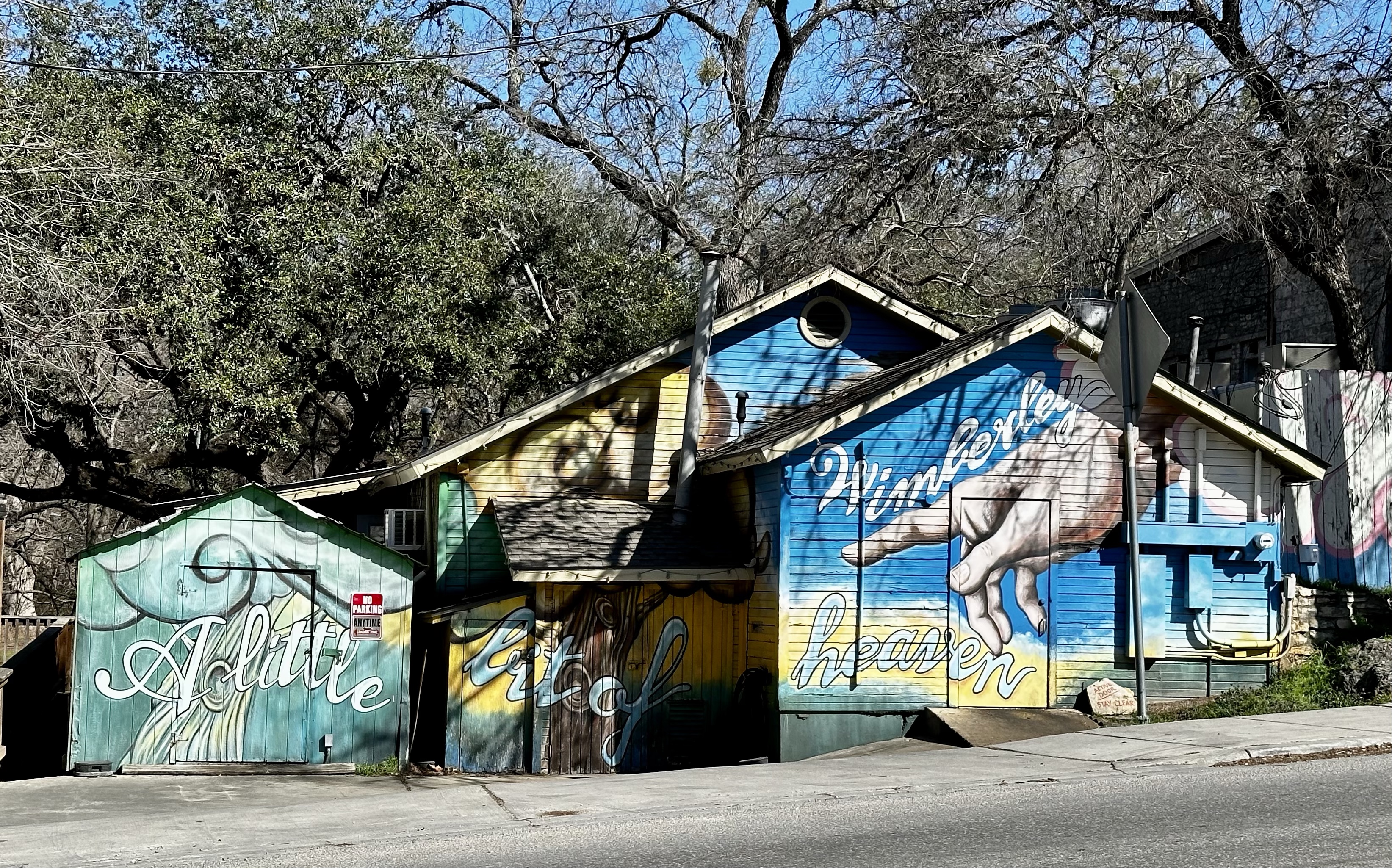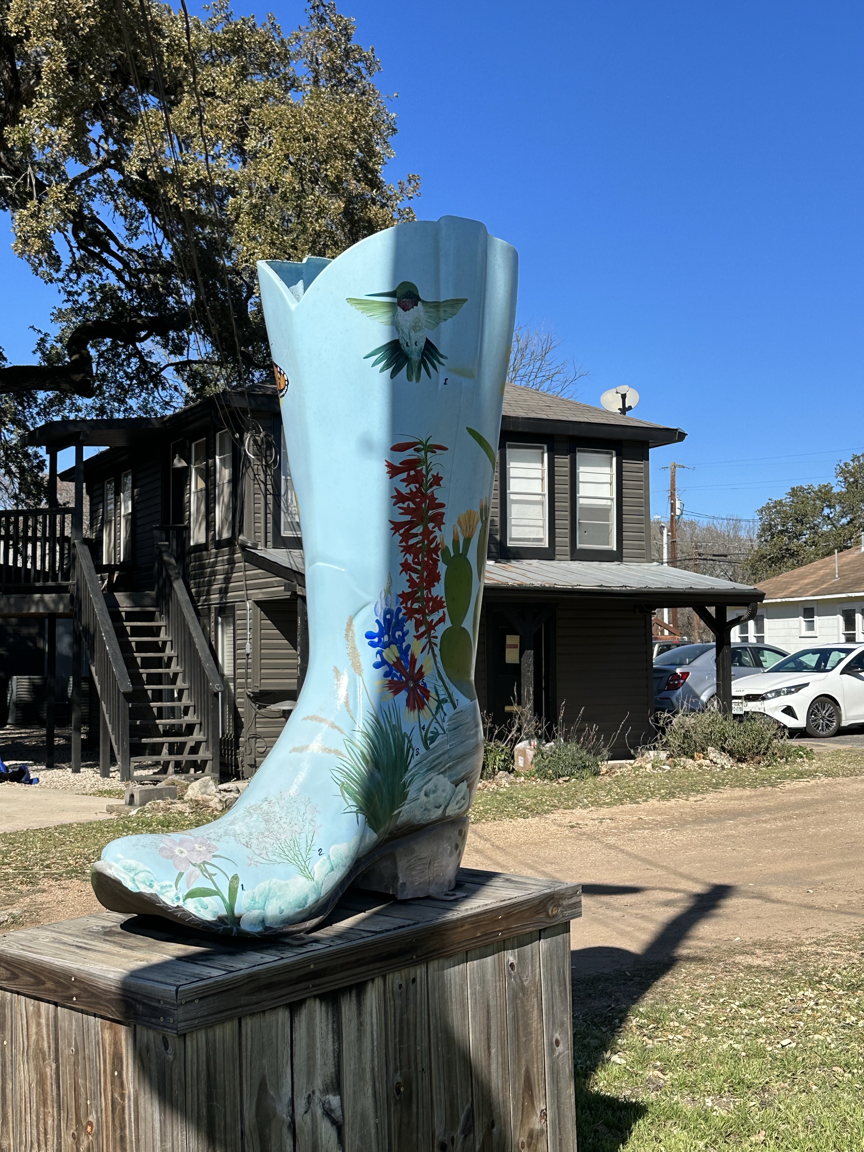The final stop in Texas Hill Country was Wimberley. We noticed that as we got closer to Austin, the towns became more gentrified and less cowboy. Wimberley was a great example of cutesville, ‘Keep Wimberley Beautiful’ signs everywhere, they were certainly trying to, if you like twee. It was a great spot though with a river walk along The River Blanco. Not a town for its architecture and not particularly photogenic, but lots of small shops catering to homewares/antiques/junk for day trippers and retirees. They also had an outdoor Painted Cowboy Boot fetish it seemed. Not wanting to fall into that category we hot footed it rather than line danced, to Austin for big city blues and maybe some more, and different, perspectives!