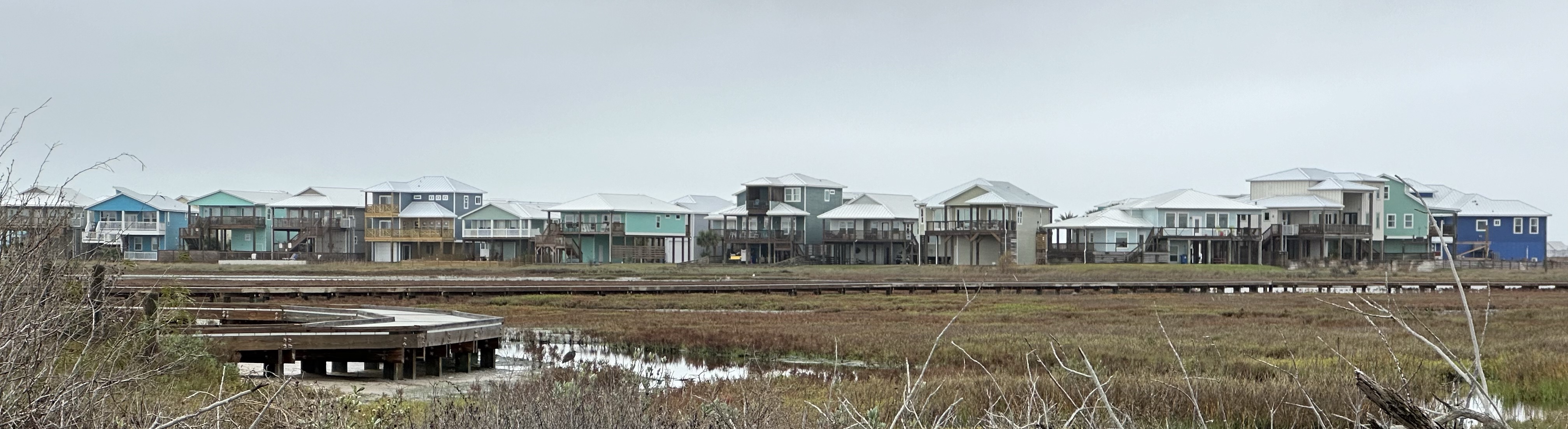 There are lots of State Parks and wildlife preserves or refuges along the Gulf Coast and even though it was damp and drizzly there’s still much to explore. The coastline is dotted with stilted, pastel shaded, feather board homes, waiting to be battered by the next hurricane but the rest is primarily given over to nature. Passing through a few very small towns, at a set of lights, we spotted a Charity Shop with a window slogan ‘Offset Your Sins with Blessing Credits’…. pretty highbrow, we guessed it meant, please buy from here and you’ll be credited for your sins??? Anyway, we arrived at a misty ‘Padre’ Island, no I’m not kidding!