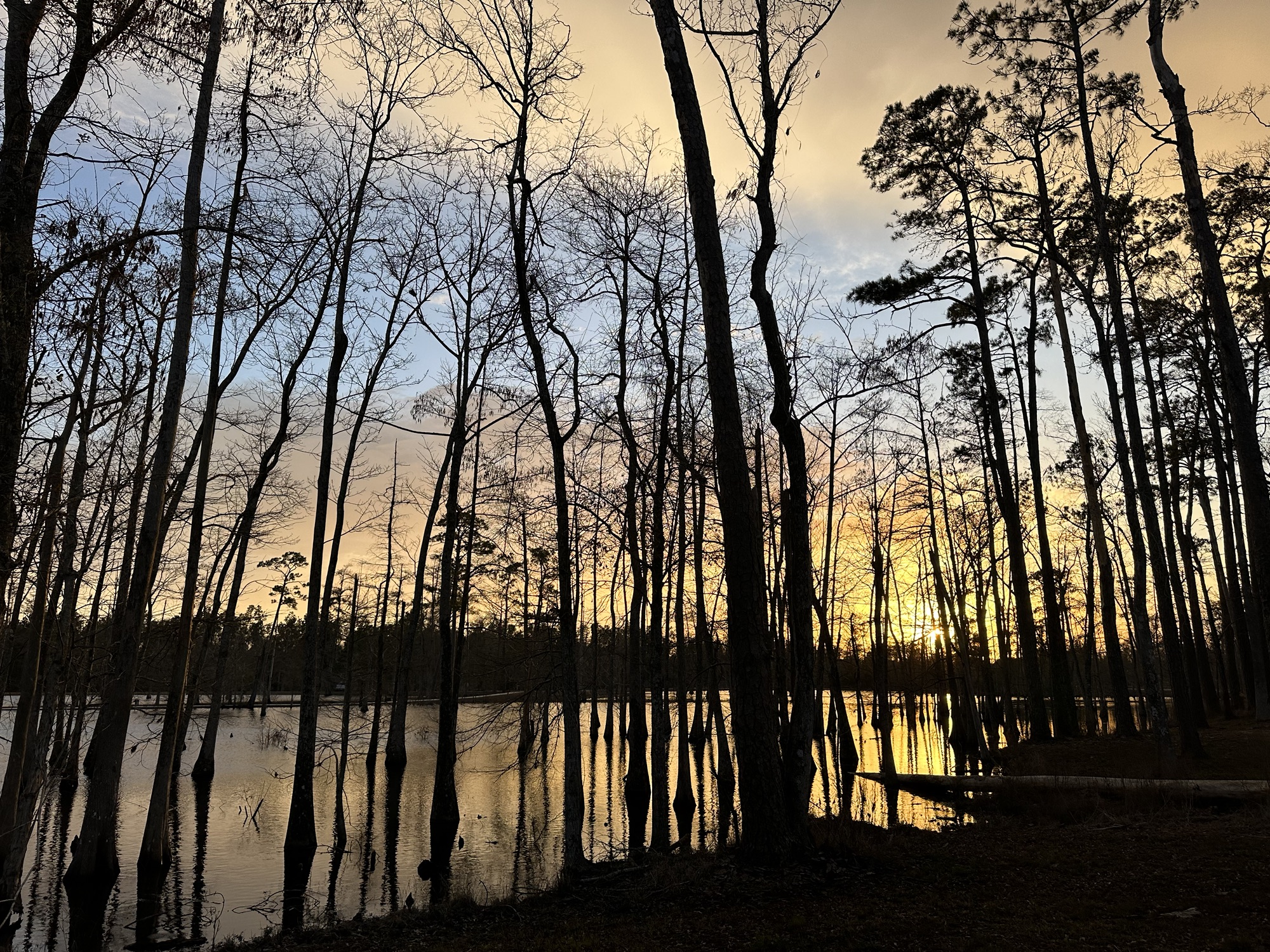 The whole of the Gulf Coast had been inundated with rain, thankfully, as they had such drought last summer. It has its downfalls though, does the rain…. mosquitoes come up for blood, and in Louisiana, the humidity is sapping of energy. After the rains stopped we headed to ‘Big Thicket’ for a walk among the swamps and tree’s, yes it was muggy but as dusk came in, it was gorgeous with the frog chorus of gribbits. Then we headed to Sam Houston Jones State Park . The camping looked very different to the google earth images, because it had been completely wiped out by 2 hurricanes in 2020. Sadly, so many of the glorious Magnolia trees were also lost. We had a good walk around the area though, met 3 local teachers for a natter and got bitten. It was a stunning spot though, especially as the sun went down, the Cypress trees reflecting in the calm waters.