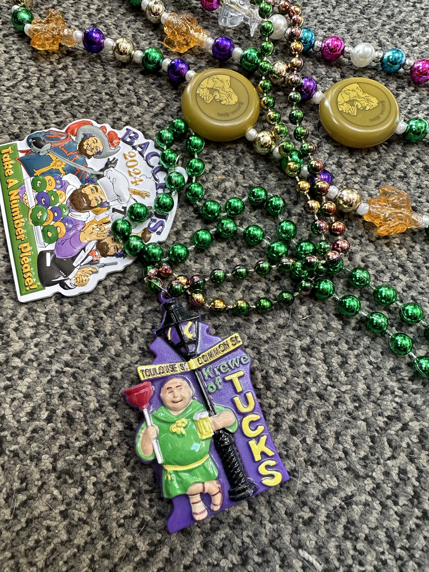 There are lots of small parades but the most spectacular are those of the Super Krewes, Rex, Orpheus, Bacchus, Endymion and Zulu. Combined, these are over 150 floats, some over 300ft long, and as many marching bands. The Super Krewes also tend to have guest celebs. as Kings and Queens. We’ve seen Hugh Laurie and Harry Connick Jr for example. A Krewe is basically a private club where its members contribute a fee and also spend a lot of $ funding the beads and other gifts thrown off the floats. Many are charitable and are involved in a lot of good works through the year. When the parades slowly grind their way along the streets, you can’t help but get caught up in the screaming, cheering, reaching and trying to catch beads and everything else thrown off. It’s harmless fun and there’s a kindred spirit of friendship and fun everywhere. We met lots of fab people and have a selection of our trinket catches to bring home. This includes ‘Mardi P’ our luminous pig 😀