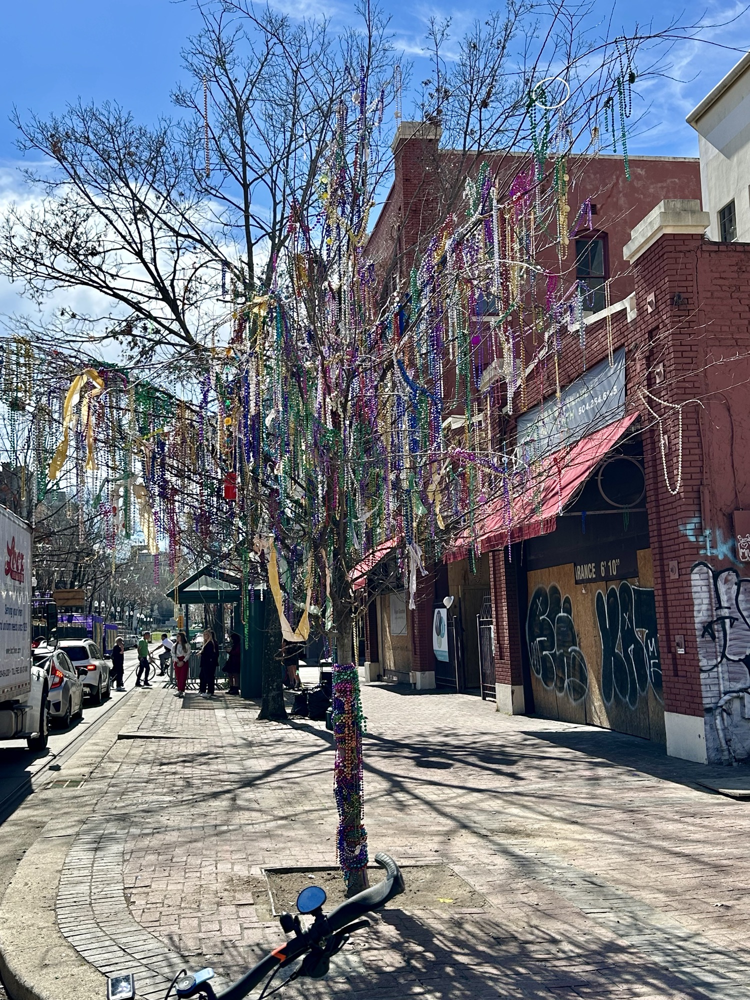 We were parked at a super location, on the edge of the French Quarter so a 10 minute walk to the ‘action’. We had brilliant neighbours, guess what, they were Canadian (all the best neighbours are) from Montreal. We had a fun time with them. After the partying finished, we spent the following day, as New Orleans took a big sigh, on the bikes around the city. The city does the most incredible clean up job, night after night but there’s some aspects that take time, like getting the beads out of the trees on parade routes! In the swanky Garden District many houses were dressed or being undressed. Can never tire of walking those very crumbly streets. There’s a new tradition since Covid, when festivities were cancelled, called ‘Yardy Gras’ which involves people dressing their houses up like floats, so people could just drive around and look. Seems to have stuck as a new aspect of celebrations (and perhaps out doing the Jones’s?)