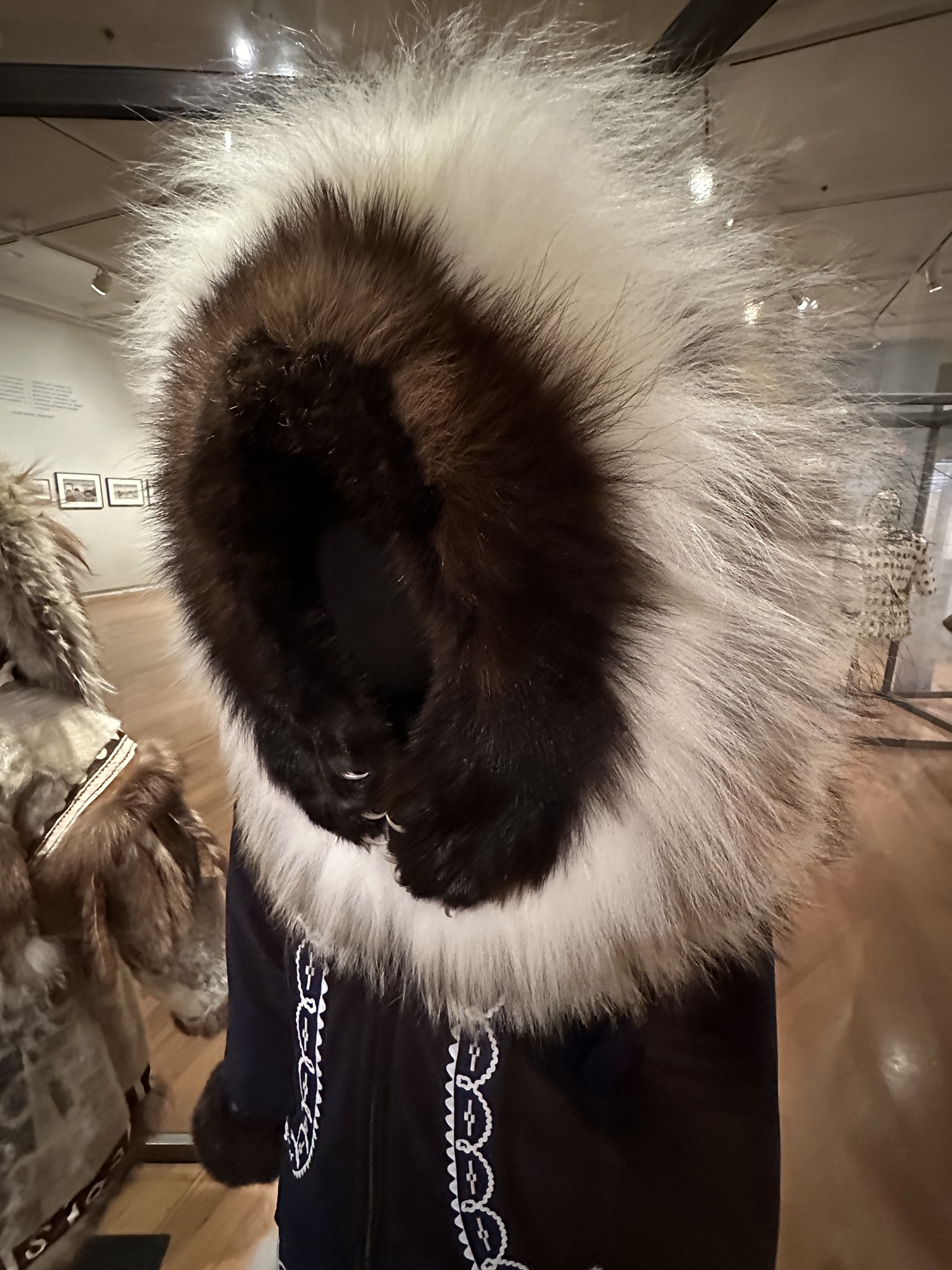 Within the same buildings was an exhibit about Alaska Native Parka’s. How they are made, what from, what they can symbolise and the significance of family designs. There is so much legacy in the design and style of Parka’s that we’d never realised, they are much more than a warm dry coat. The ‘sunshine ruff’s’ of women’s special occasion parkas, have numerous furs, the softest being against the face. They can identify a wearers family and ancestry, their village and region. It was fascinating to learn that the Parka is part of the social identity and the craftsmanship was way beyond my basic sewing skills.