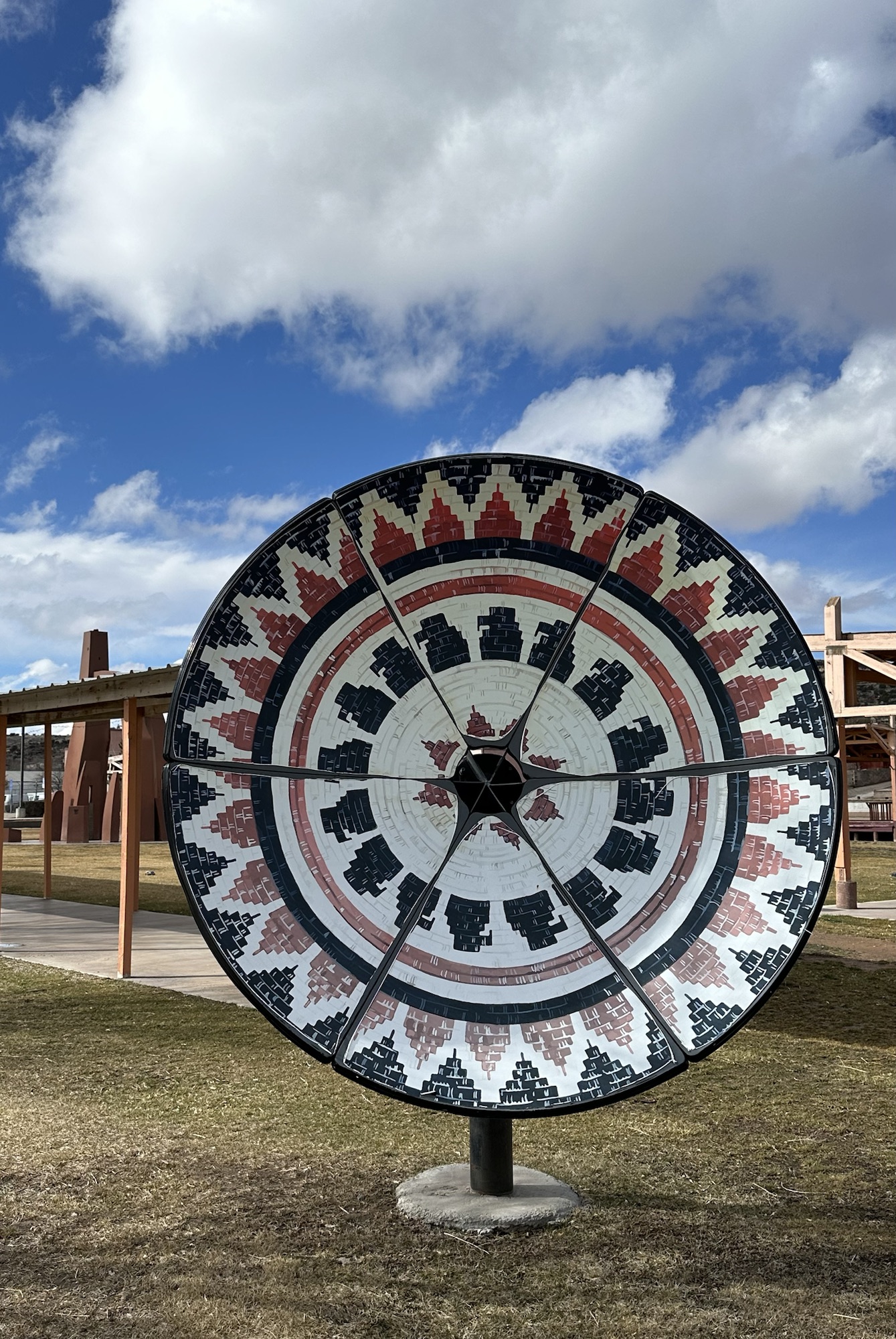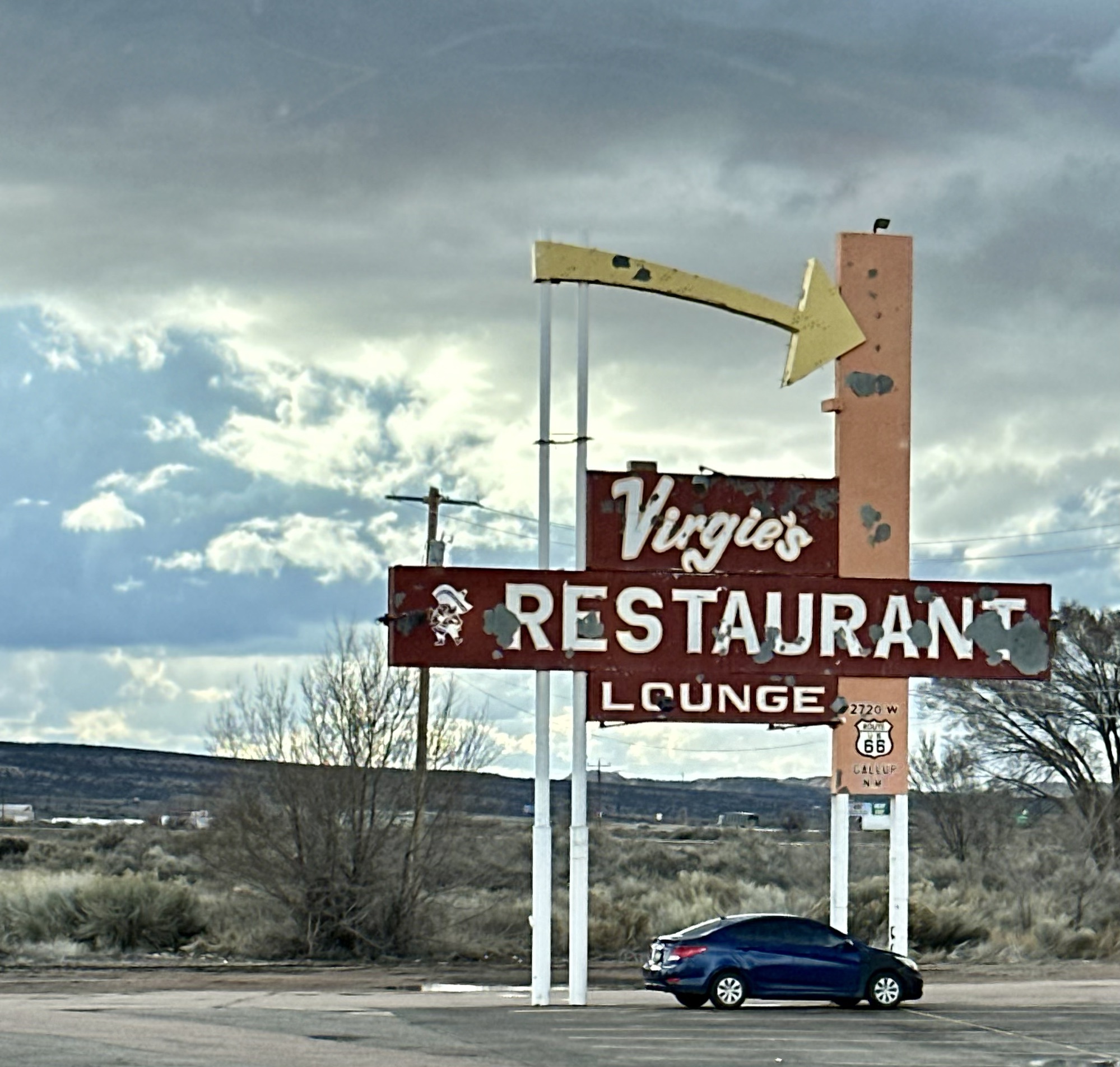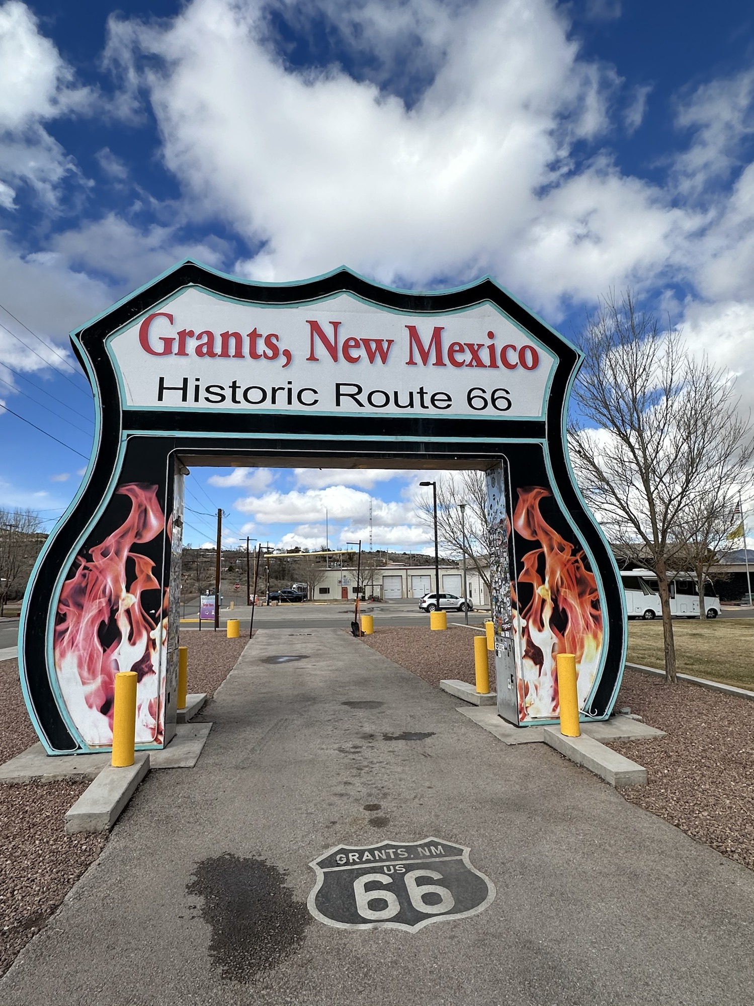 Picking up part of the New Mexico Route 66 stretch we passed through a fair few non descript and pretty much lifeless towns other than Grants, with it’s drive though arch photo op and fabulous street art ‘baskets’. Dating back to pueblo families, they made baskets for ceremonial functions, wedding and healing ceremonies in particular. Some were obviously made for trade too but it was great way to show off history in their giant form. One below has Ravens, a keeper of sacred laws and the other is a Navajo Wedding Basket. It was our last full day in New Mexico and the landscape didn’t disappoint, Mesas (flat topped mountains) looking like mountain steps for giants, moody skies, hoodoos and the vast barren and dry, tumbleweeded flatlands, far into the distance. We arrived in Gallup for our last rodeo…