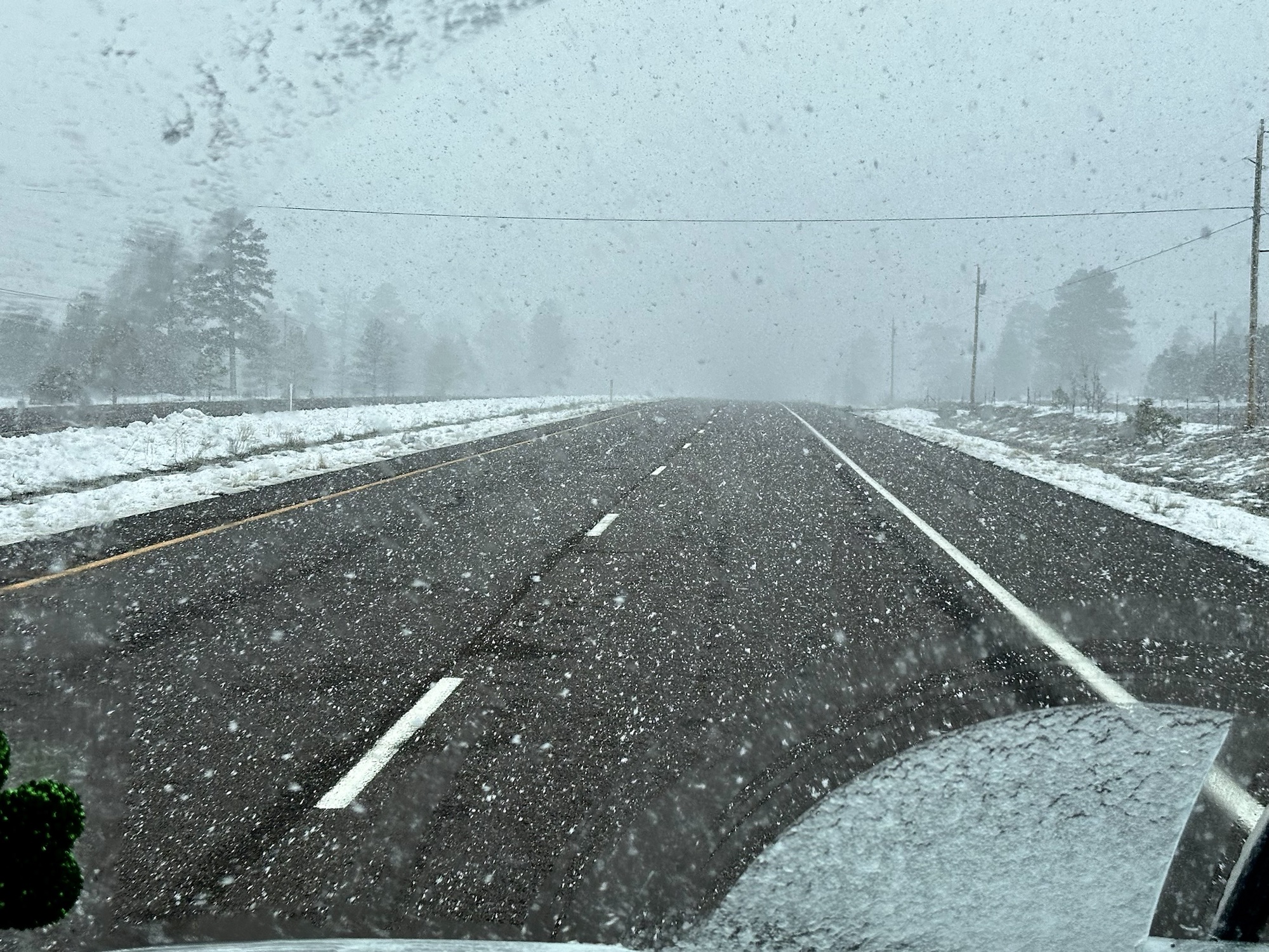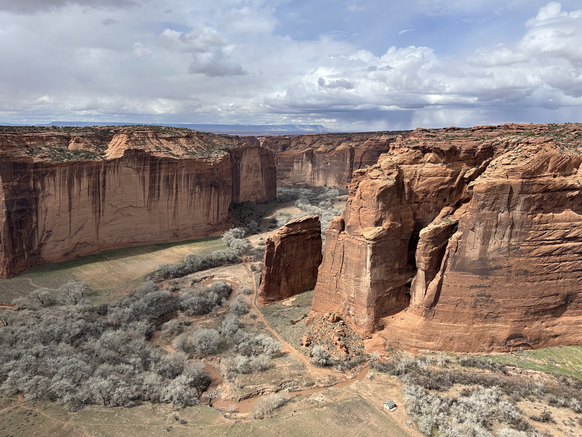 Heading into Arizona we were in a snow storm which made life interesting, thankfully we were able to tuck in behind a snow plough. At 7720ft hail storms were settling and the white contrasting with the red rocks was a sight to behold. All around we had moody skies, lightening and winds, not what you’d expect in the high desert of Arizona. We arrived at Chelly National Monument relieved.