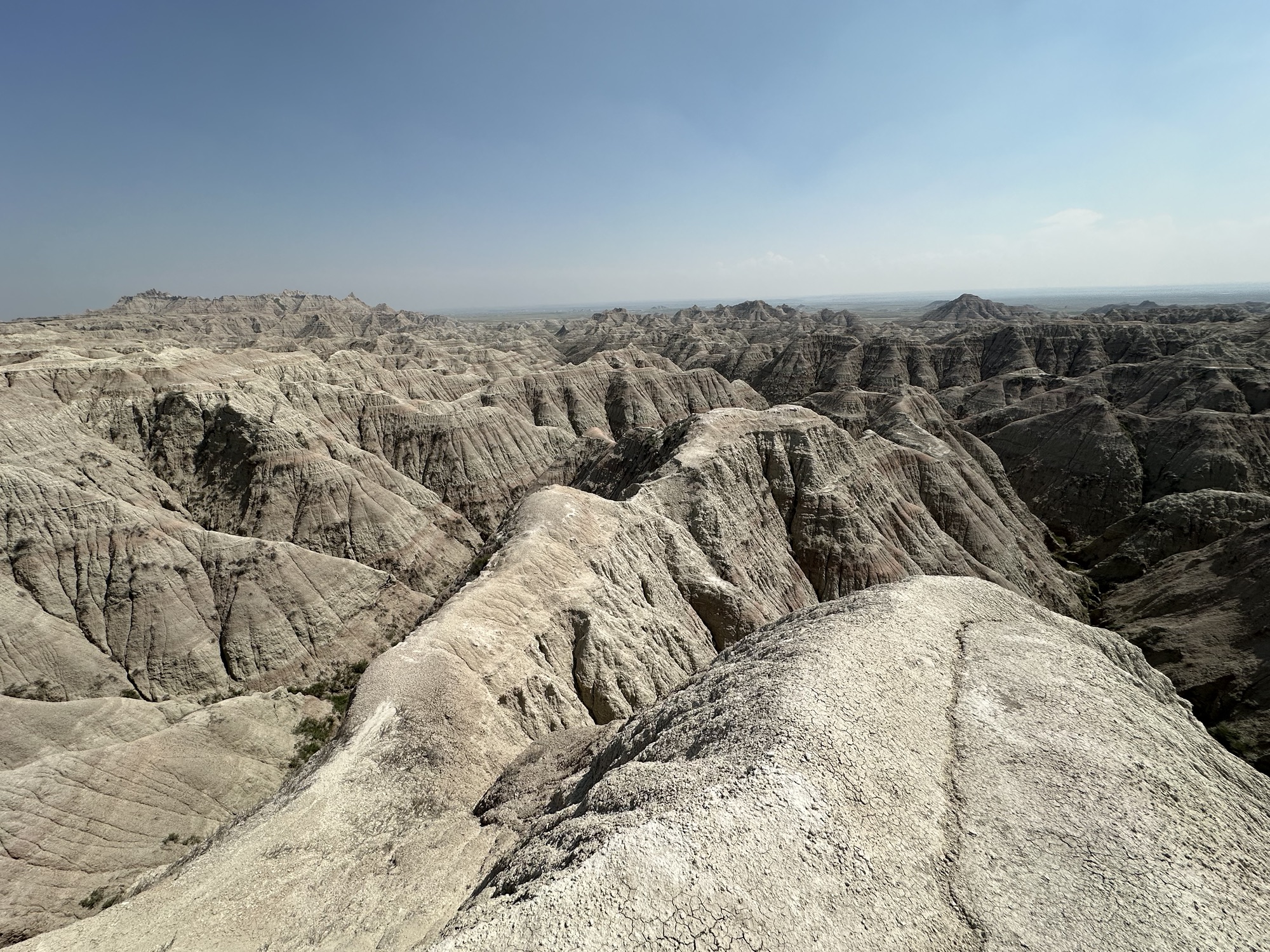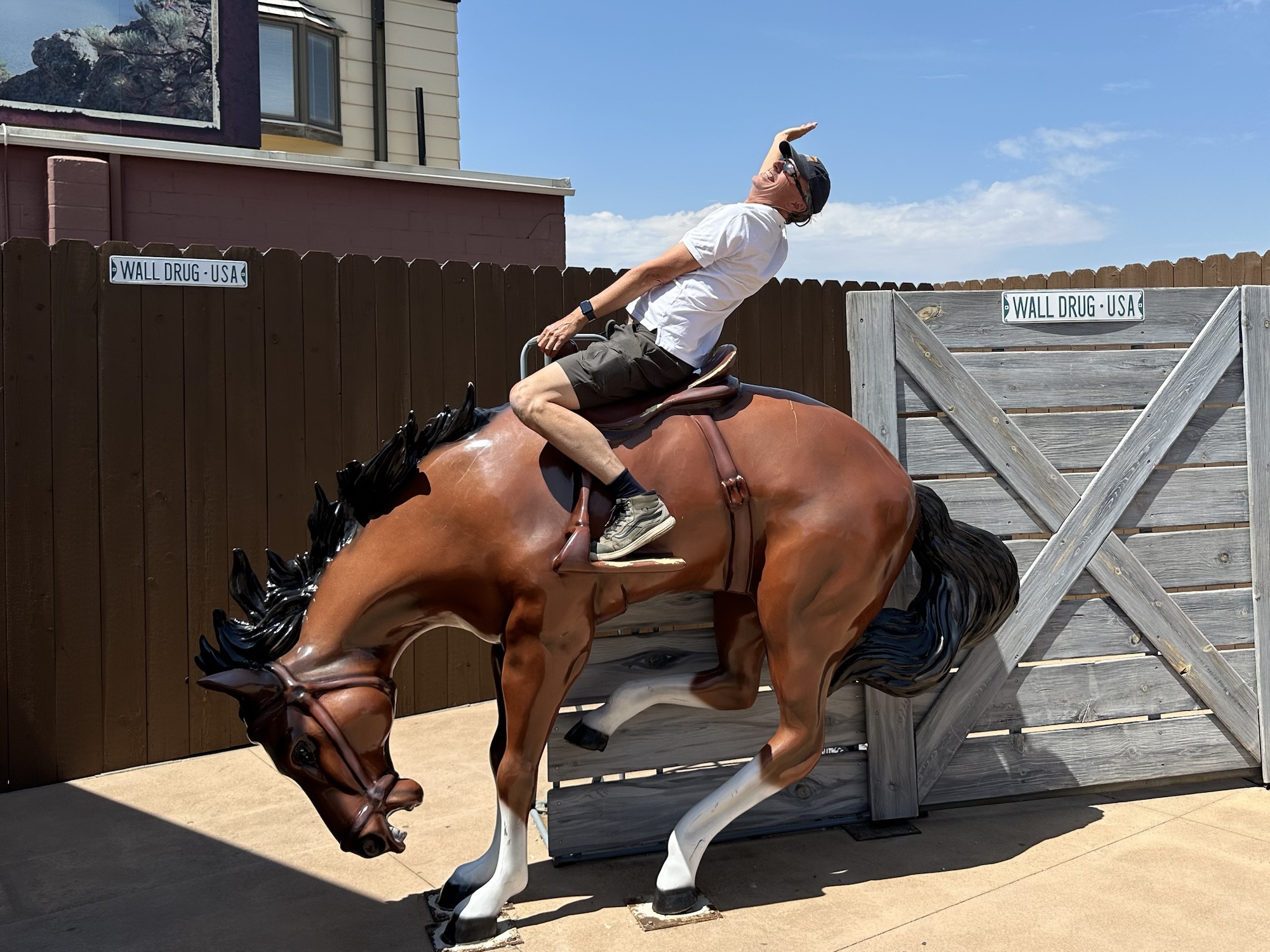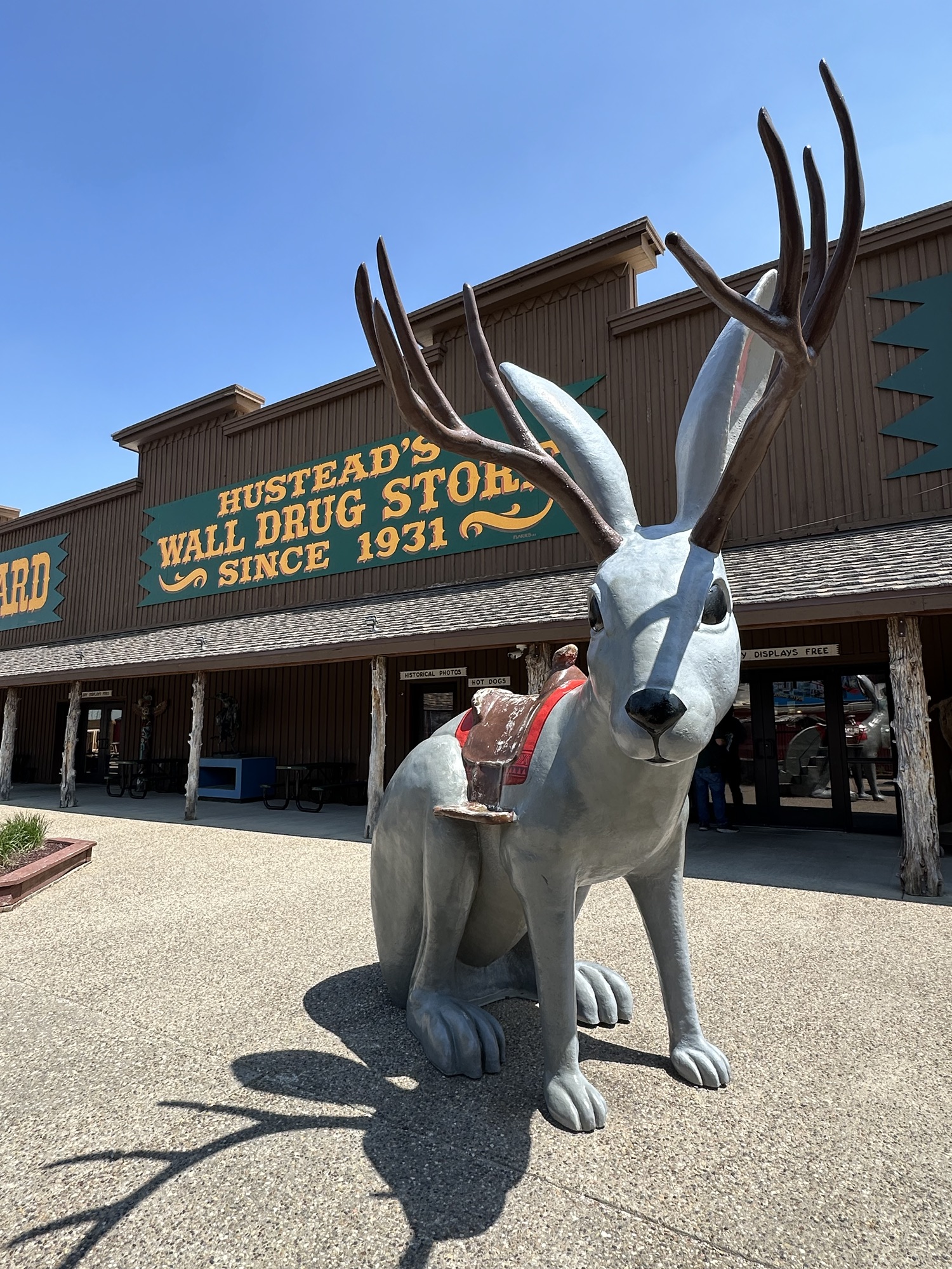 South Dakota is home to Badlands National Park. To get there involves a detour to ‘Wall Drug’. Someone took marketing the place to another level, we counted 63 roadside billboards on our way there. In 1931 it was a failing small town apothecary until in 1936 the owner had the bright idea of offering free iced water to passing travellers and the rest is history. The free iced water remains but the not free tourist junk throughout the now enlarged establishment isn’t. A giant tacky gift shop full of kids being pandered to by parents to keep them quiet, a cafe with nothing veggie, the self described ‘Unique Experience’ is accurate. The donuts were good though!