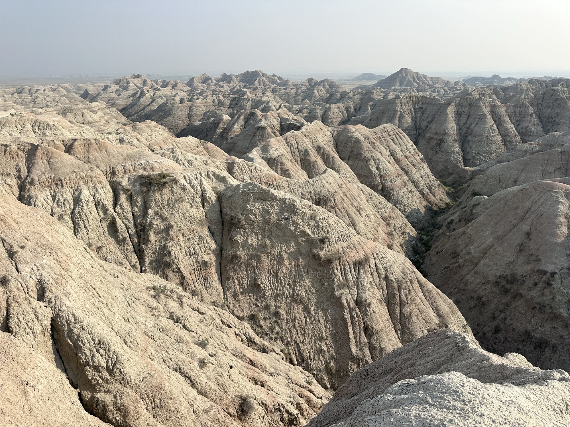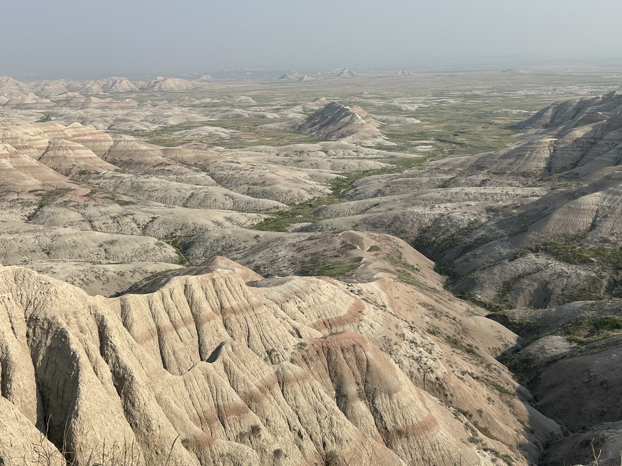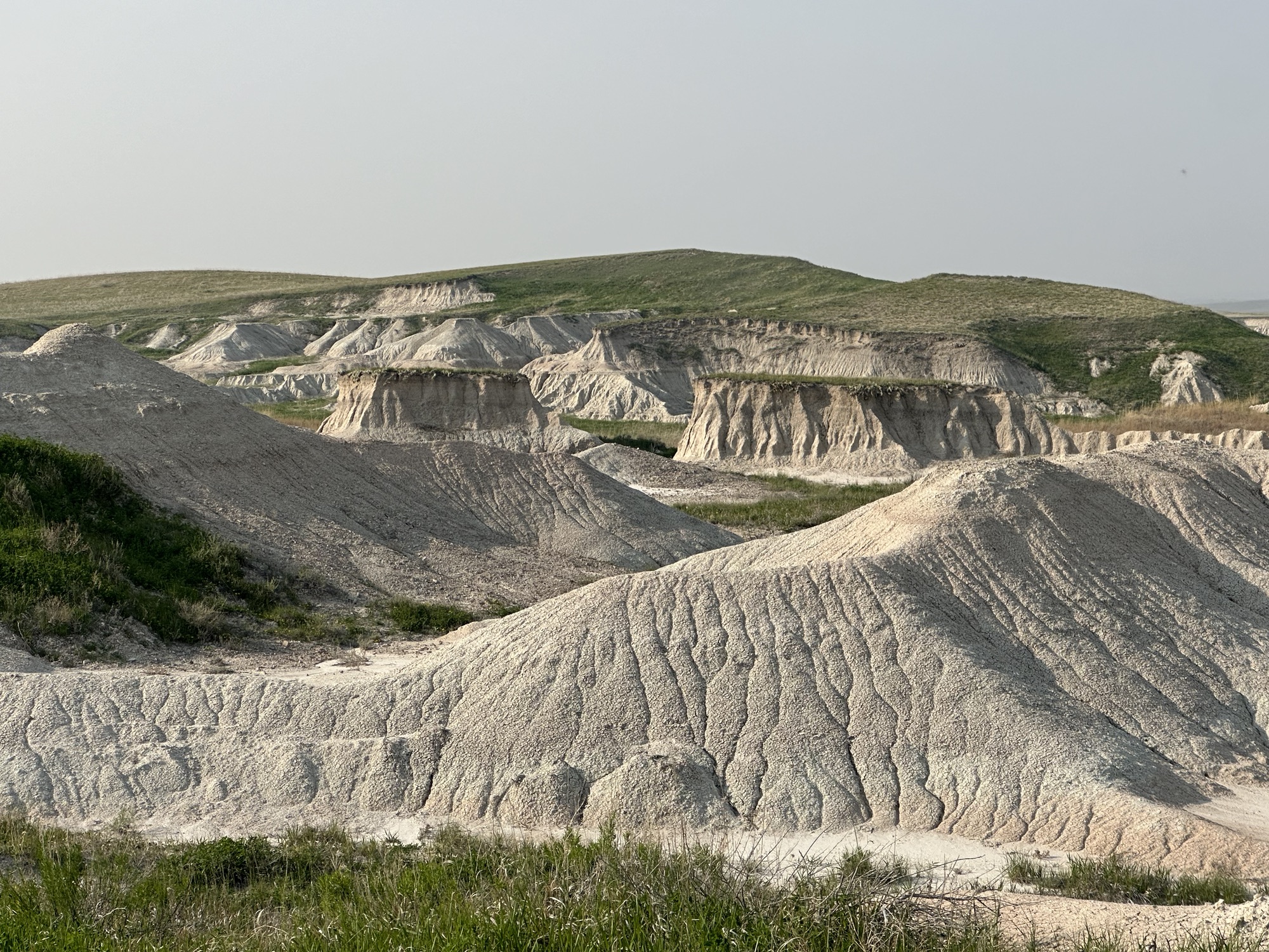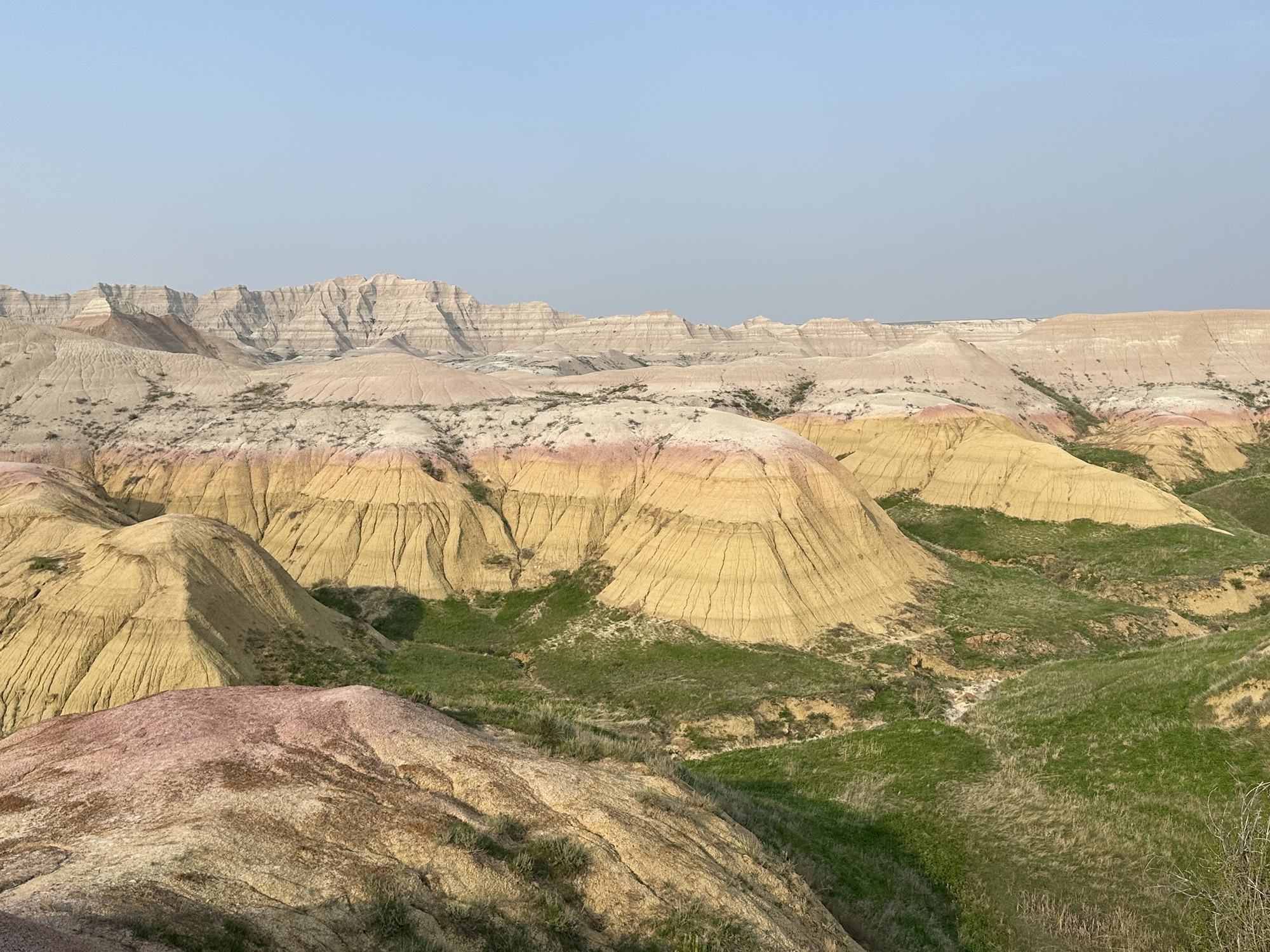 Buffalo Gap National Grasslands is home to Badlands. Covered in a haze, it didn’t distract from the otherworldly landscape. Not the easiest to photograph, even for The Tall ‘professional’ One, the vast landscape of air and water chiseled spires, ragged ridges and rugged canyons was a wonderful panorama. There are three kinds of layer within, the lower prairie along The White River Floodplain is lush at this time of year, with scattered Buttes rising from the floor. The upper prairie has grassy flat topped buttes and undulating land, soon to turn dried out yellow next month when the summer hits. It is a good time of year to view as the greenery creates contrasts and relief. From the other levels, the eroded fins are visible and some of the rock colours are vibrant in a way we’d not seen elsewhere. The landscape is very contrasting and of course, there’s Buffalo, Pronghorn and prairie Dogs to entertain.