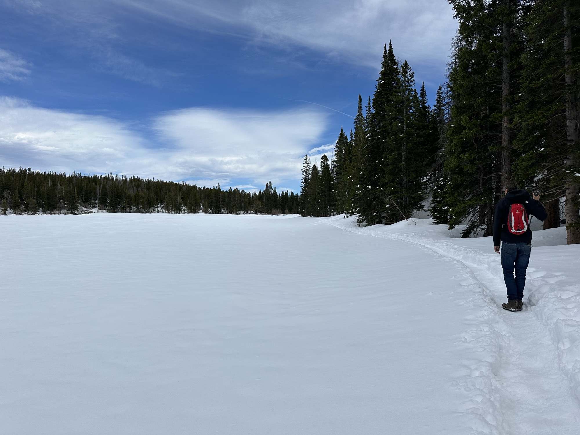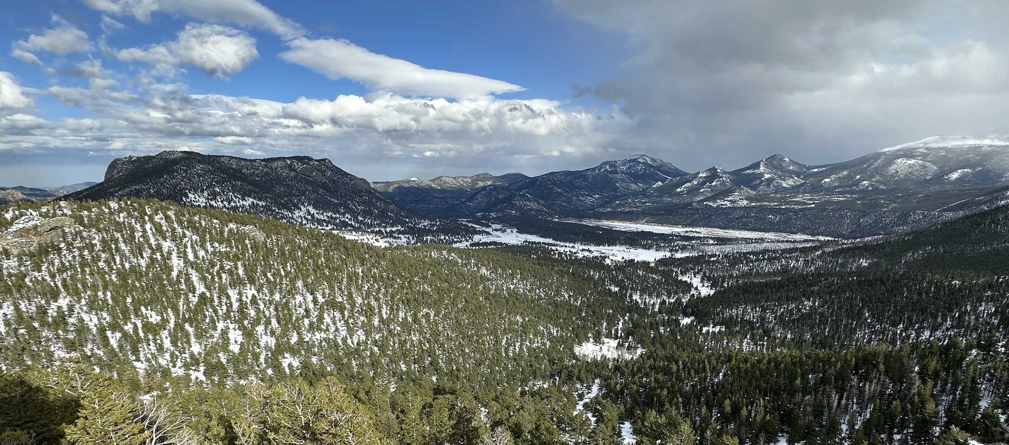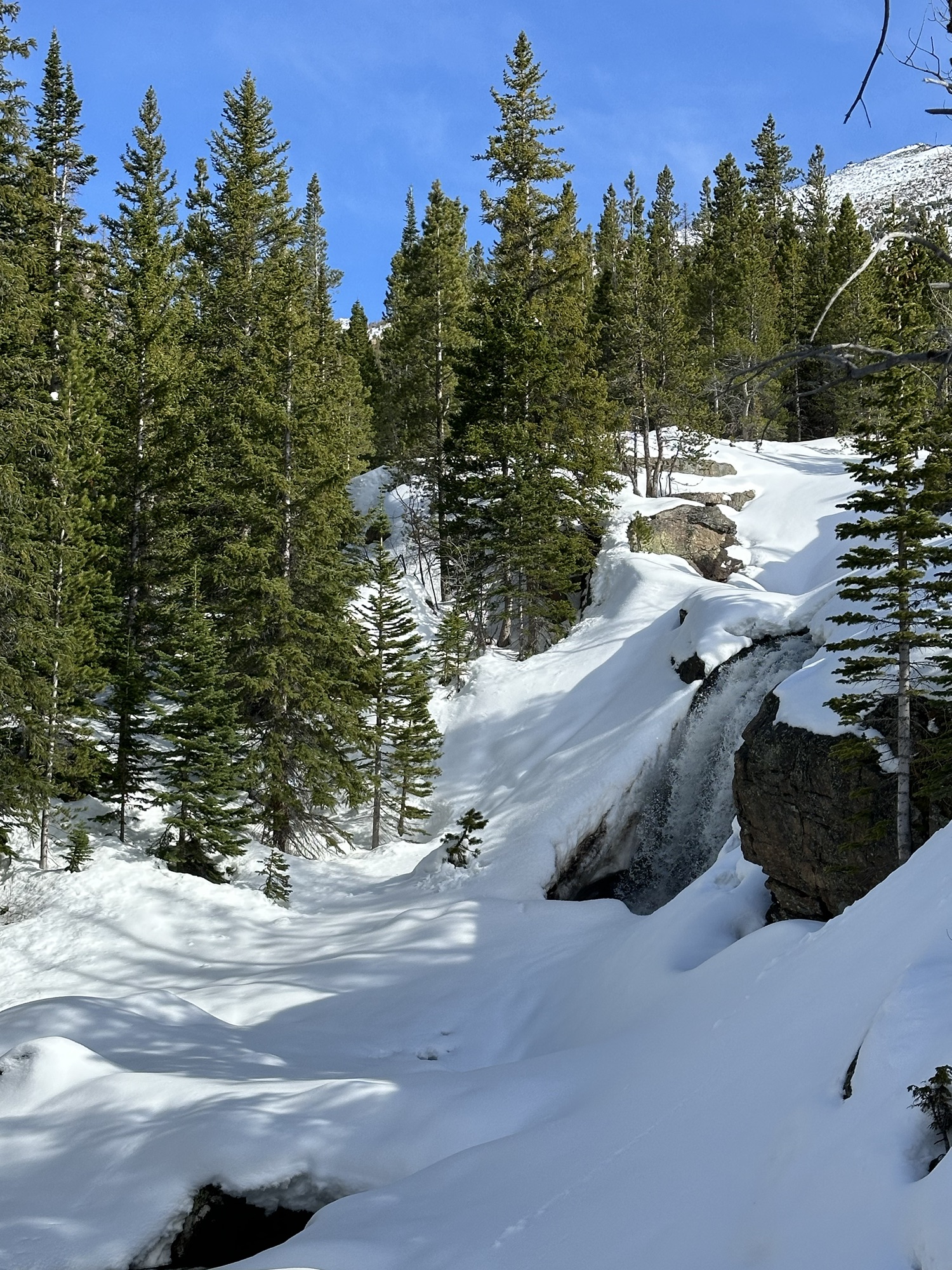 At Sprague Lake we were treated to Osprey diving in for fish which we’d never seen and Bear Lake, frozen still and covered in snow, made for a tricky snowpack hike, being careful where we put our feet. Alberta Falls was another ‘Alice in Wonderland’ type hike in the snow among the trees to a cascading waterfall. The snow melt across the Rocky Mountains was certainly upon us, narrow streams finding the paths of least resistance to hop over and tiny spring flowers everywhere. The weather was ever changing, strong winds blowing the snow off the 13k ft peaks, snow flurries and sunshine.