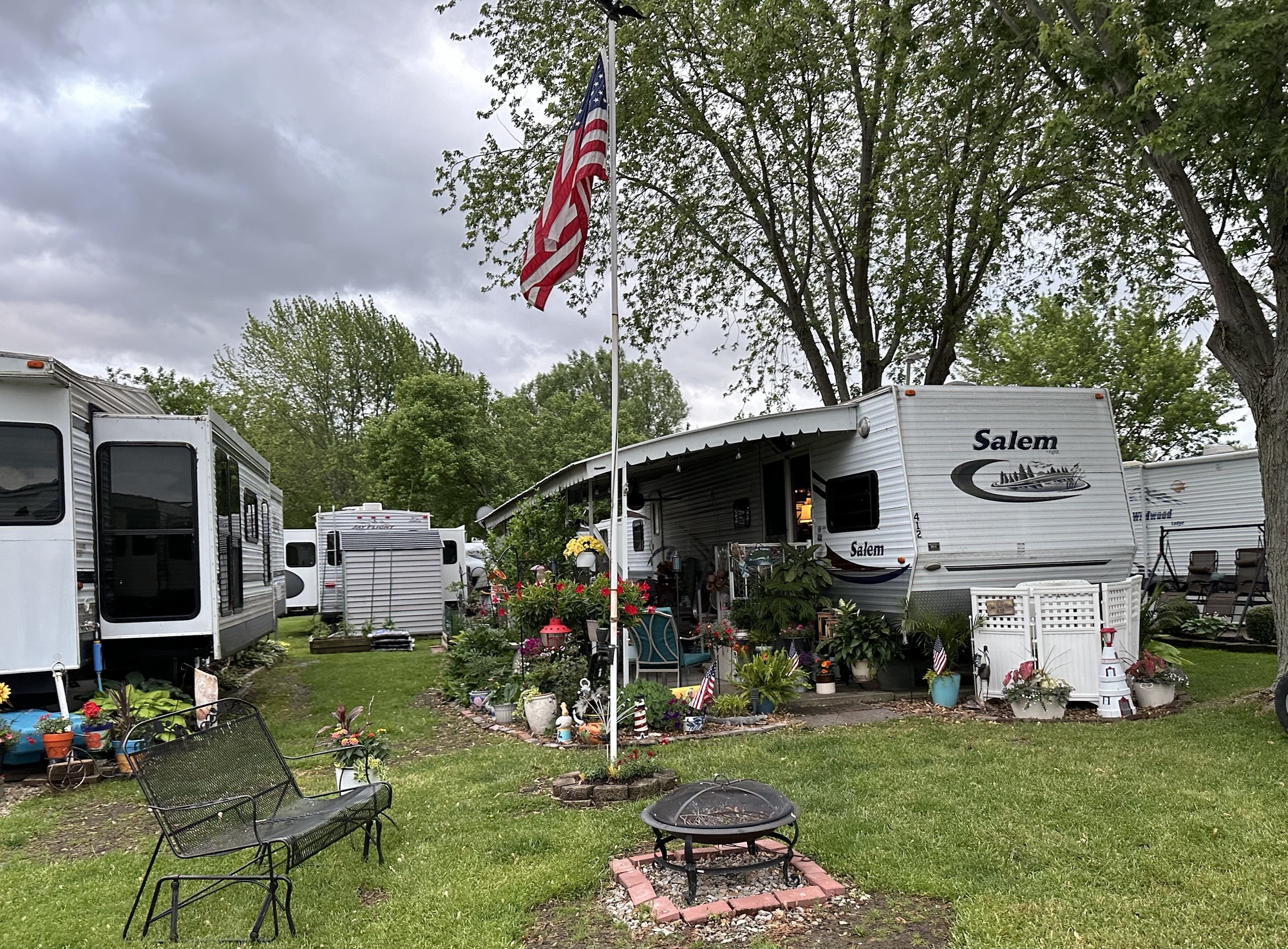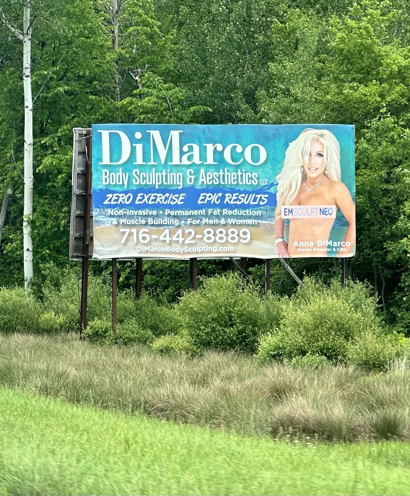 The storms from Lake Michigan seemed to chase us East as we progressed from Indiana into Ohio, through the tip of Pennsylvania and into New York State. Flooded campgrounds were the norm, along with marooned golf buggies (transport of choice around a ‘seasonal’ campground!) Not too much of note other than surprise at the promises on a billboard, and shock at some of the billboards, at the amount of stock in RV manufacturer’s yards and fields that we passed. The vast majority are built in Indiana and it seems they did a bad job at forecasting demand post Covid. The market has dropped like a stone for new, as the barely new ‘in reality we didn’t enjoy camping’ stuff is for sale at silly prices on the internet. In contrast, we were surprised at the mount of vineyards we passed, on a sizeable scale too. No doubt the rainfall contributes to the green and pleasant land, and being the ‘older states’ they have a different look and feel.