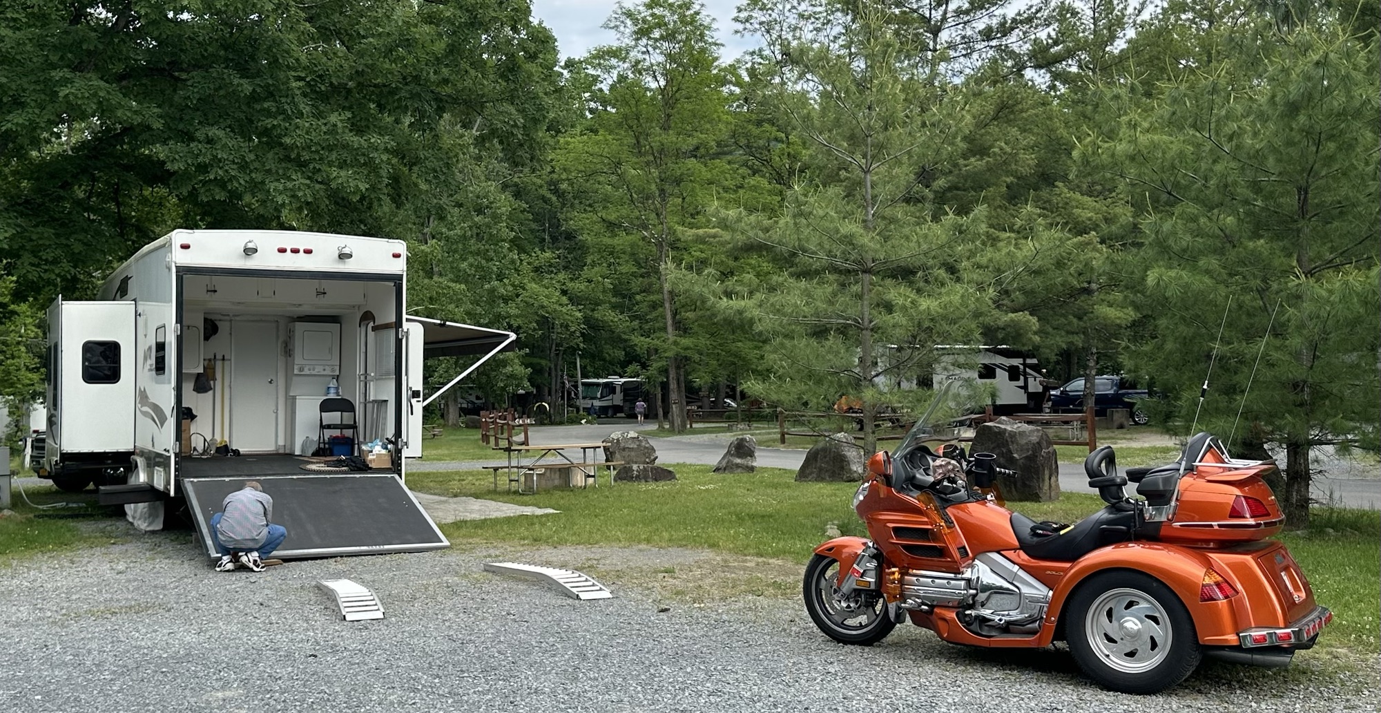 The book and film “Last of The Mohicans” is based on events in the area and the French massacre of 1757 (French Indian War). There’s a place on the edge of the town called ‘Bloody-Pond’ where a battle massacre took place in 1755 when the war started. Over 200 lives lost and the bodies rolled into the lake which turned red, giving it its name. At the edge of the lake is a restored British Fort where there’s re enactments and history events. Closed, to sell its car parking spaces to angels… with ice cream. Back at the campsite we watched a trike being loaded into a ‘toy hauler’… on to the next event.