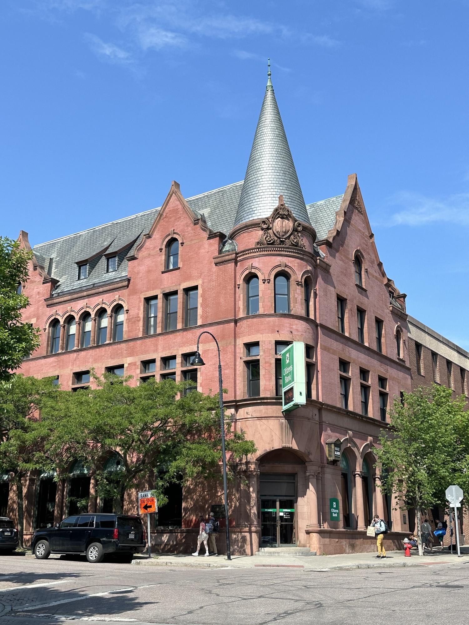 Burlington is Vermont’s main town. Wandering the downtown, it has a great vibe, the lazy jazzy sounds of school bands cutting through the balmy heat as part of their Jazz Festival. Settled in 1783 and incorporated in 1865 we could really feel the age of the place in its architecture, lots of European style and even some Roman ’doric’ columns, not that I think they made it there. The ‘Chateauesque’ Richardson Block of 1895 was a dominant building, now a bank.