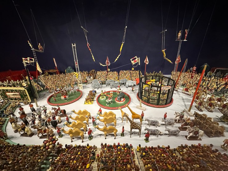 The best was however a collection of animals from a deconstructed carousel along with masses of old circus posters from the Ringling Bros; Barnum & Bailey days. There were two stars of the show. Firstly a 1/12th scaled circus procession, recreating the pomp and pageantry that used to herald the arrival. Painstakingly replicated from pictures were the most ornate parade wagons and tableaus ever designed. The whole miniature procession stretched 525 feet and Roy Arnold’s procession has to be seen to be believed.